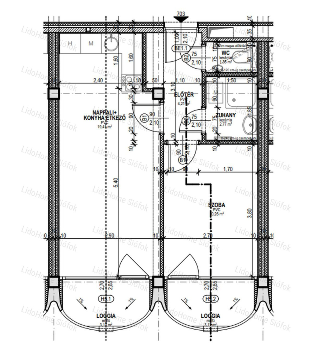 -A lakás nettó alapterülete 38 m2-es, 2 szobás, amelyhez 2 db loggia (2×3,17 m2) kapcsolódik
