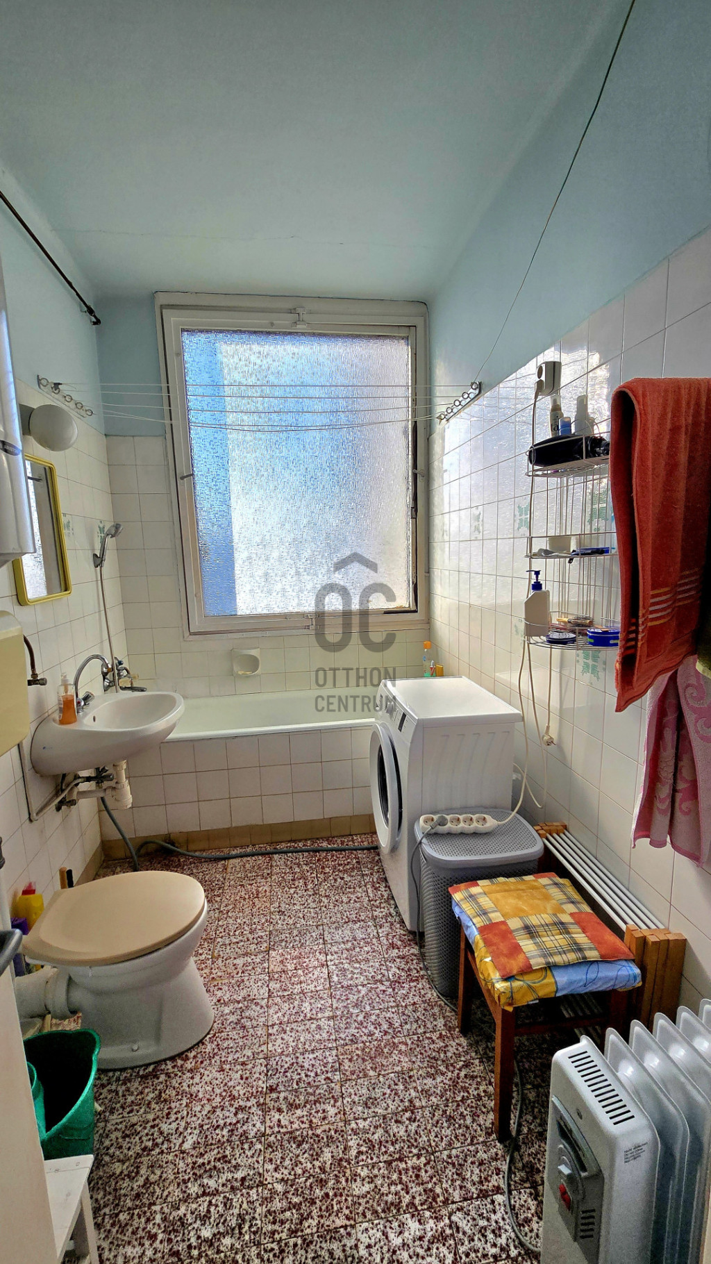 A fürdőszoba panel lakáshoz képest tágas, a WC-vel egy helyiségben található.