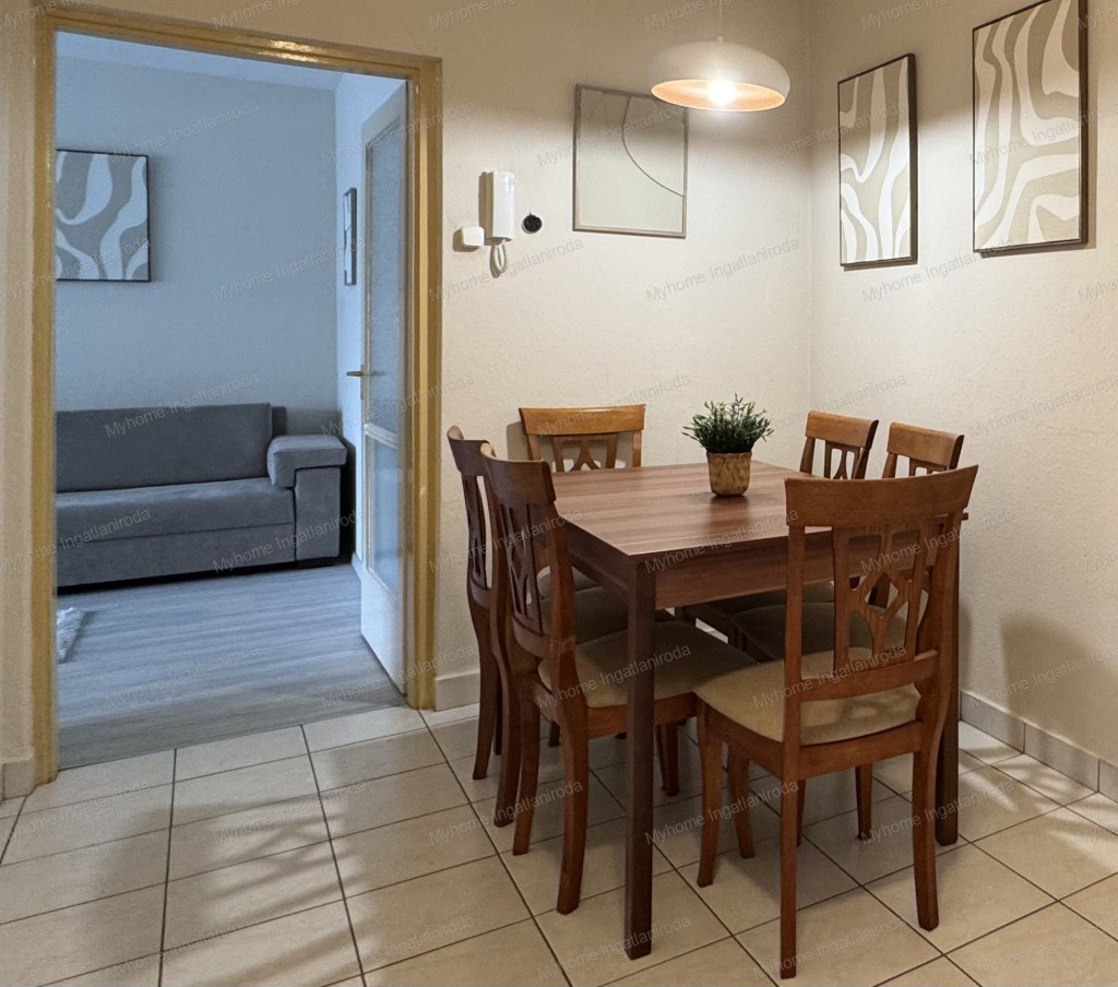A lakásba belépve egy tágas étkező fogad, innen nyílik minden helyiség – jól átgondolt, élhető elrendezés.