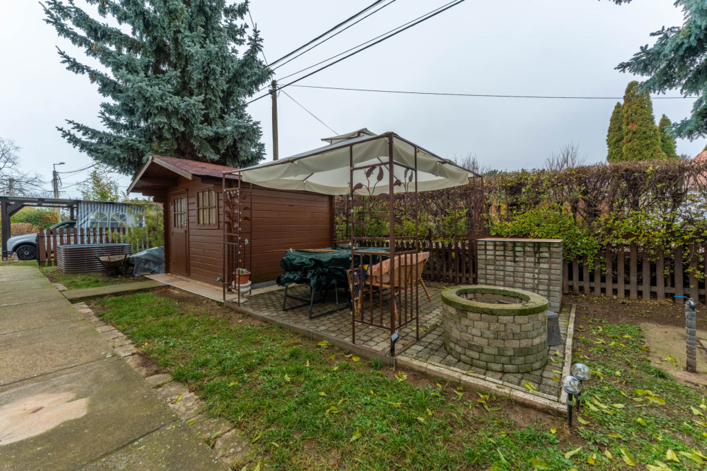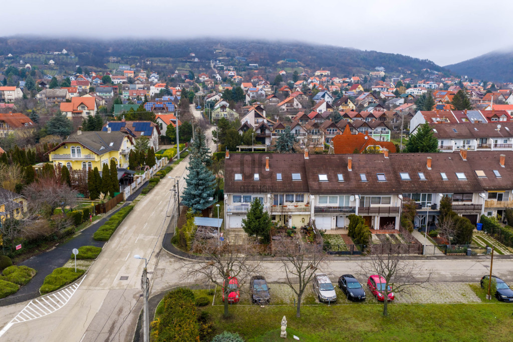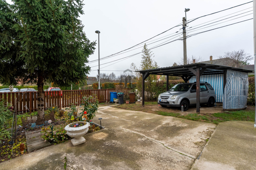 A garázs a lakótérből is közvetlenül megközelíthető. Az udvaron tetővel ellátott felszíni parkoló, sütögetésre alkalmas rész és tároló is található. A sorházzal szemben több közterületi parkolóhely áll rendelkezésre.