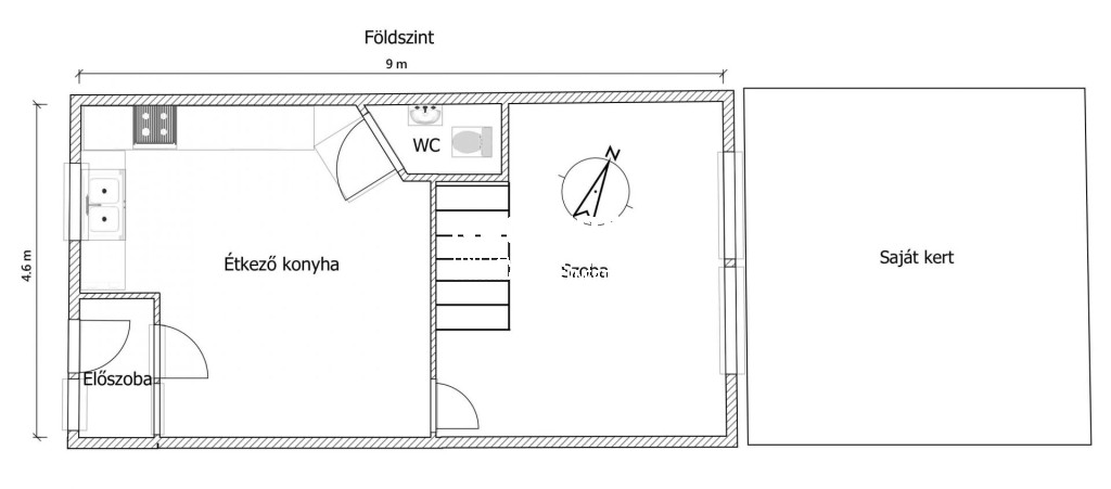 Földszint: Előszoba, WC kézmosóval, tágas étkező-konyha (prémium Bosch gépekkel), udvarra néző nappali.