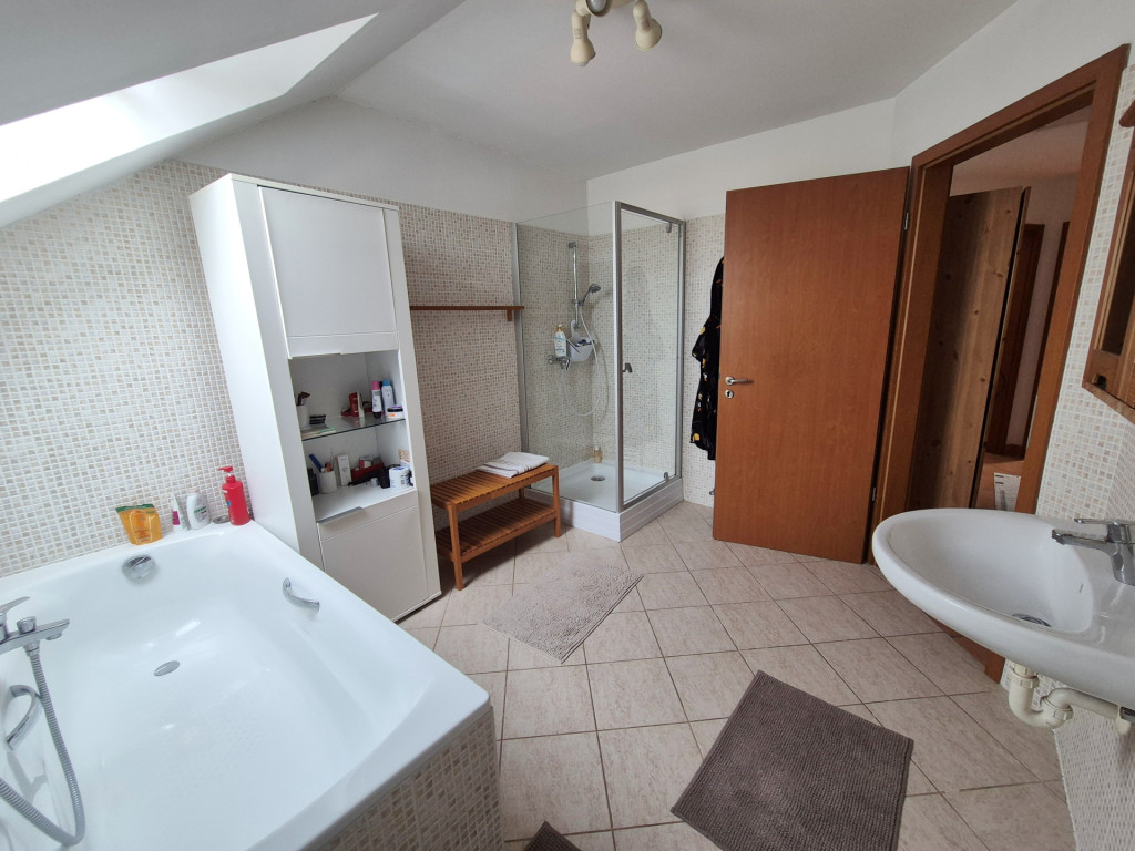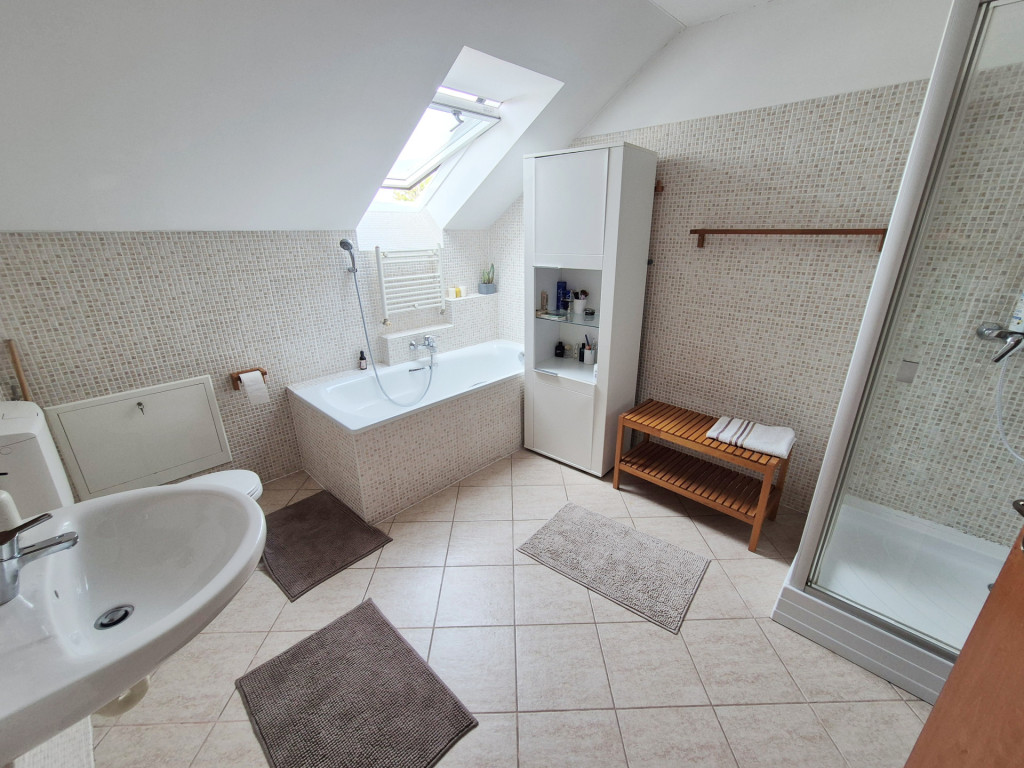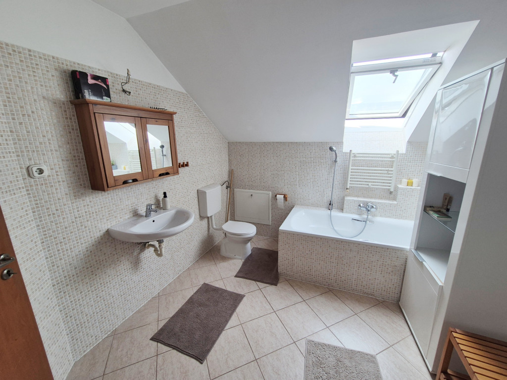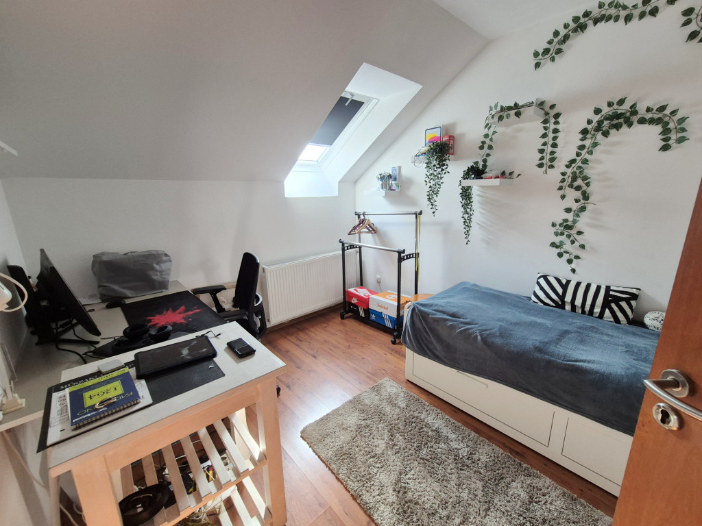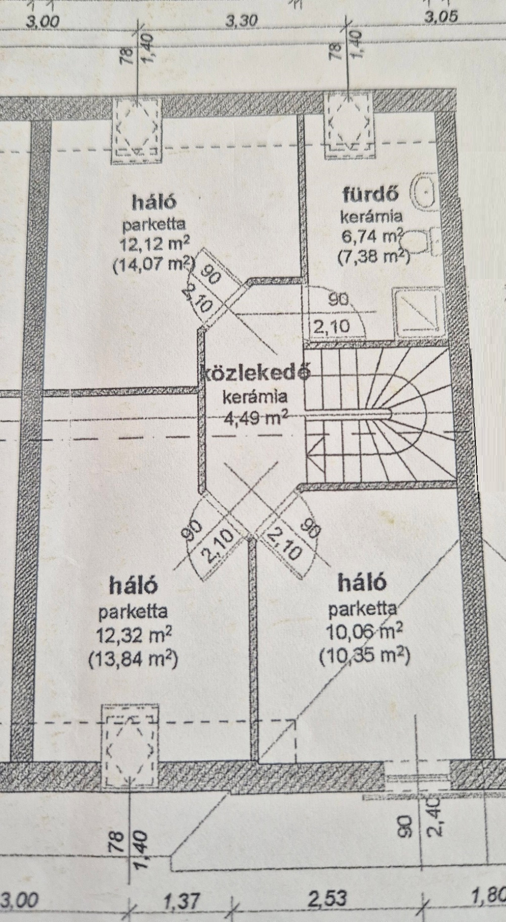 FELSŐ SZINT: Kényelmesen lépcsőfokokon keresztül jutunk az emeletre, ahol egy (4,49m2-es) közlekedőből nyílik: három jó méretű hálószoba (nettó: 12,32m2,12,12m2 és egy 10,06m2) majd egy ablakos káddal és zuhanyzóval felszerelt tágas (nettó: 6,74m2-es) fürdőszoba érhető el.