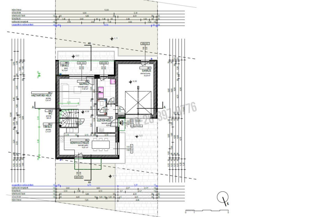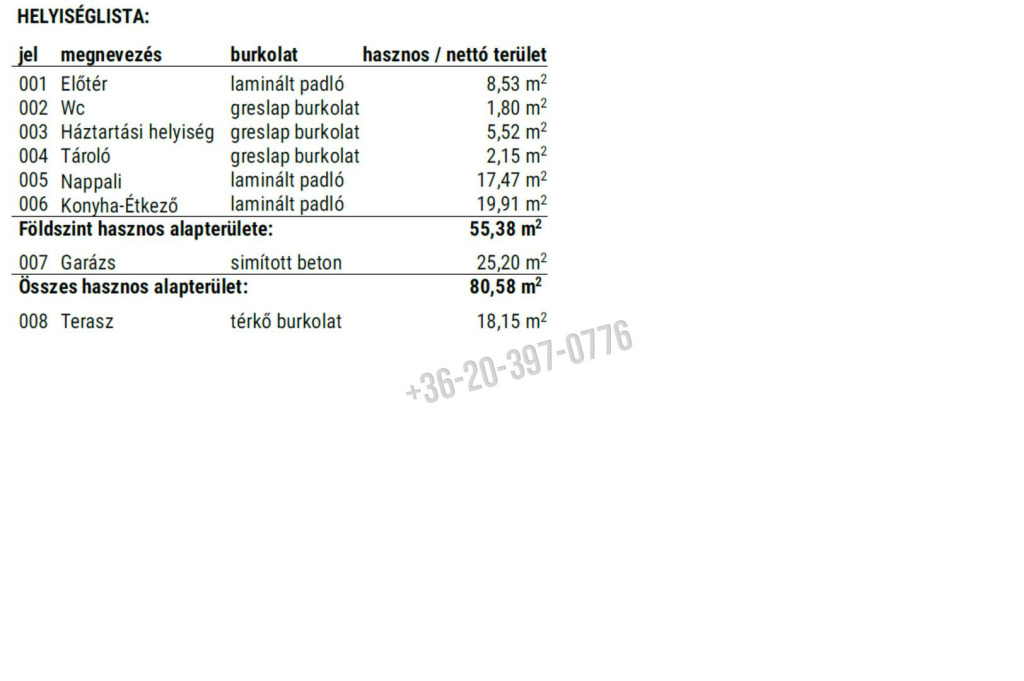– Földszint: előtér, WC, háztartási helyiség, tároló, nappali, étkező-konyha, terasz, garázs