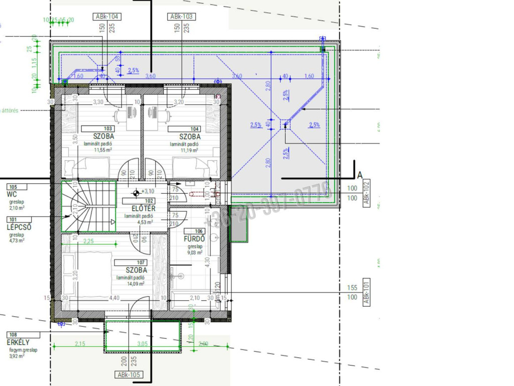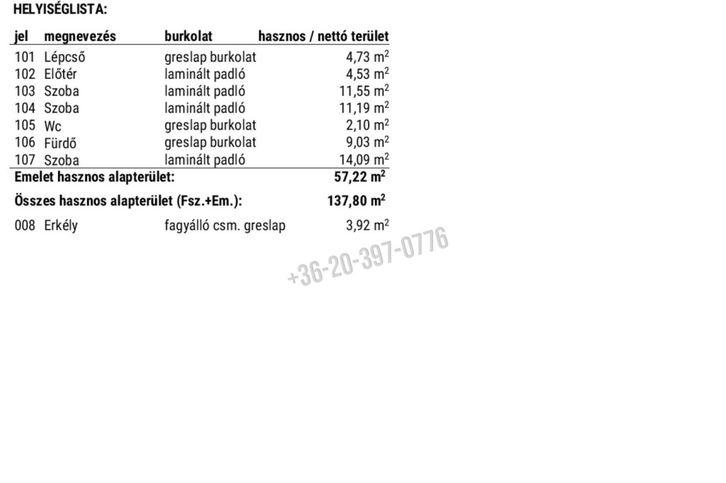 – Emelet: lépcső, előtér, 3 hálószoba, erkély, WC, fürdőszoba