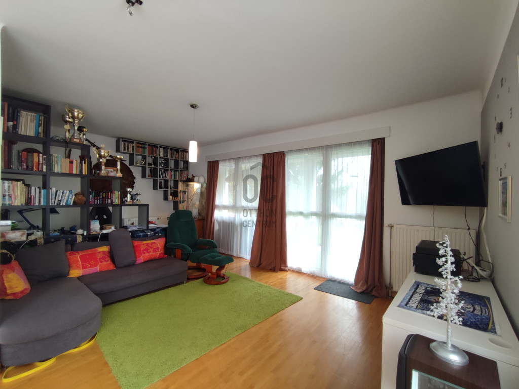 A lakás földszintjén előszoba, konyha, étkező, nappali, egy hálószoba, egy kisebb fürdőszoba, kazánház, kamra és tárolóhelyiségek kaptak helyet. A nappaliból és az étkezőből jutunk a két teraszra, onnan pedig a kizárólagos használati joggal rendelkező, jól szeparált, 443 nm-es parkosított kertbe.