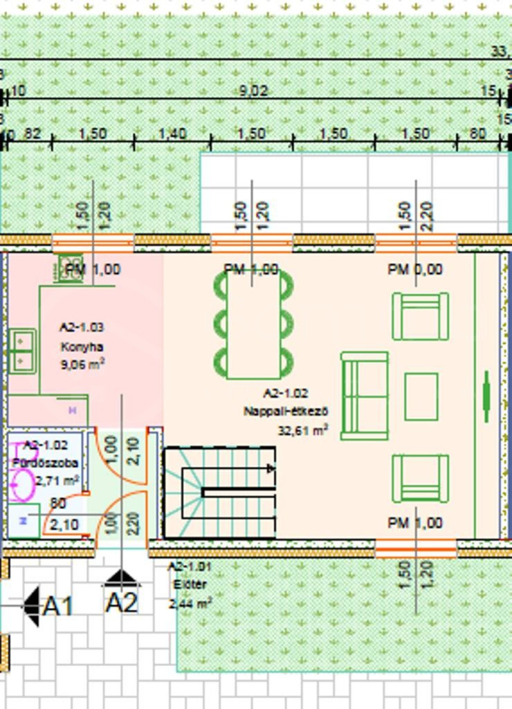 • Szigetelés: 33 cm-es főfalak + 15 cm külső hőszigetelés.