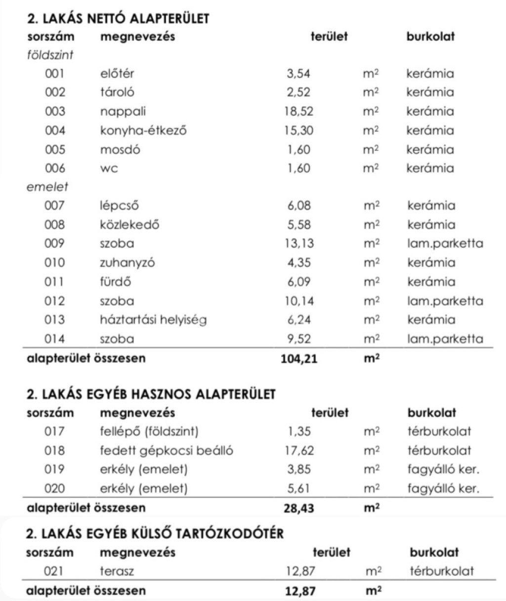 A 2. számú lakás nettó 104 m² alapterületű, jól átgondolt, kétszintes elrendezéssel.