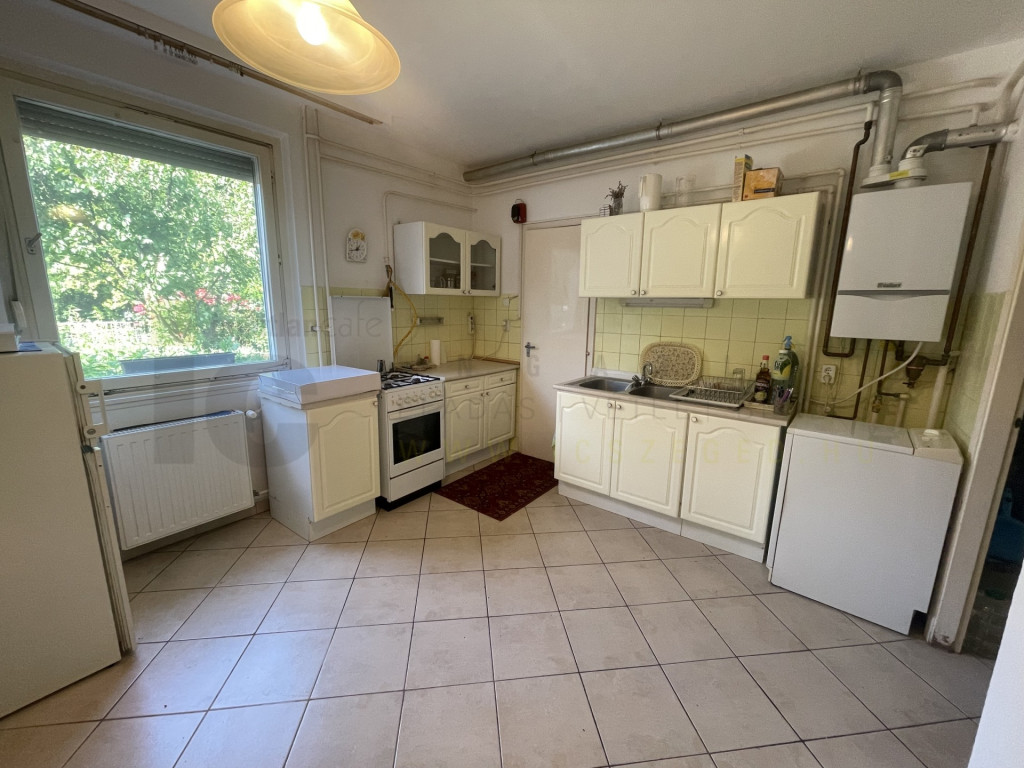 Újszeged kedvelt részén, csendes, zöldövezeti utcában 363 m2-es telken eladó egy részben felújított, szép állapotú, 105/128 m² alapterületű, 2 szintes, 2+3 szobás sorházi lakás, terasszal és dupla garázzsal.A szigetelt homlokzatú sorházi lakás 105 m2-es, 2 szintes, 5 szobával (2+3 félszoba) és mindkét szinten 1-1 fürdőszobával rendelkezik. Az alsó szinten előszoba, kertkapcsolatos nappali, konyha és egy fürdőszoba kapott helyet. A felső szinten található a további 4 szoba és a másik fürdőszoba.
