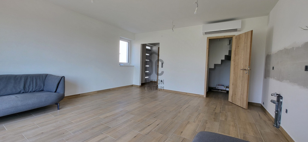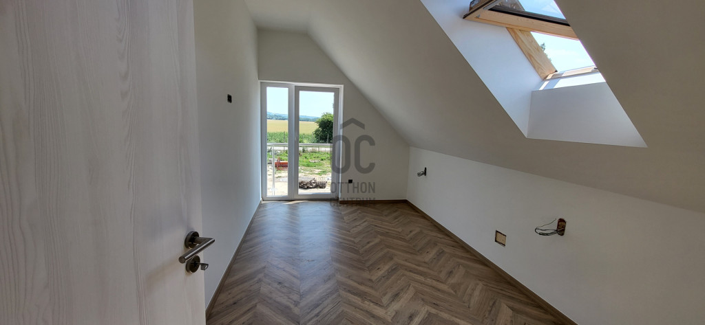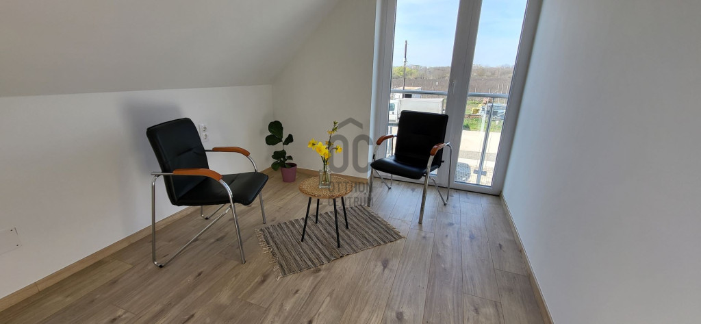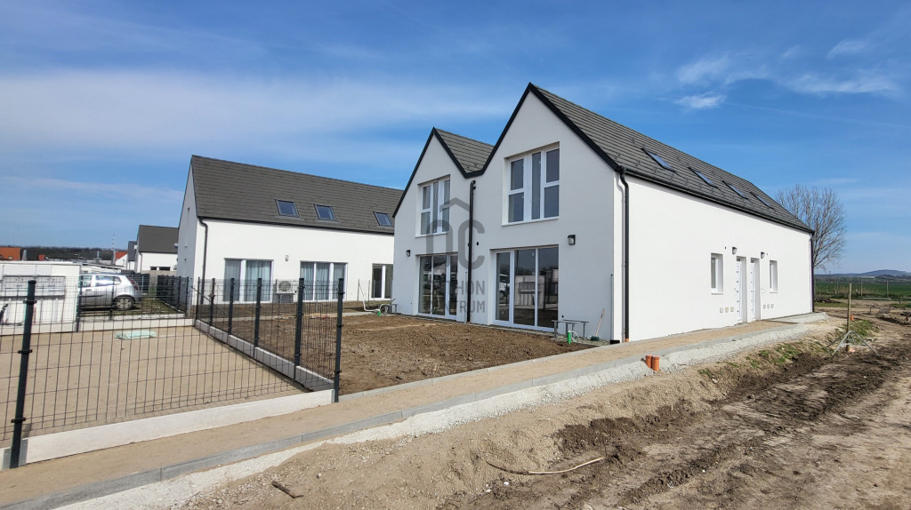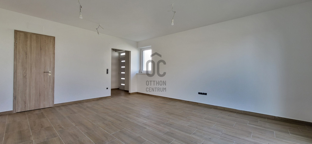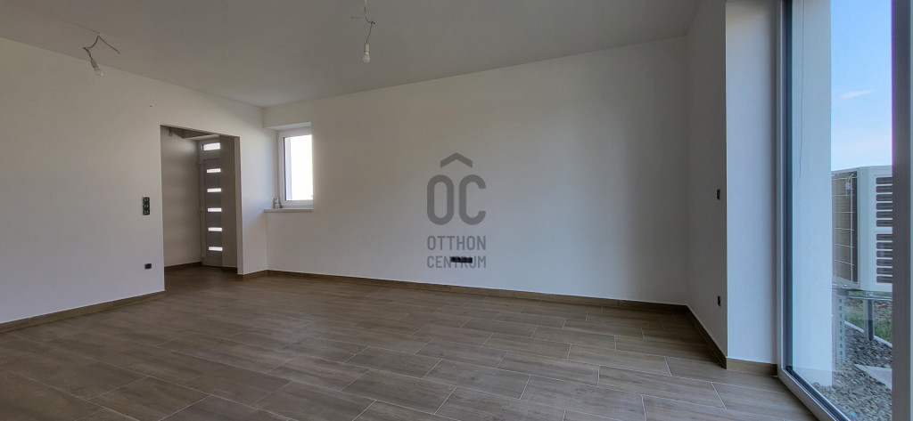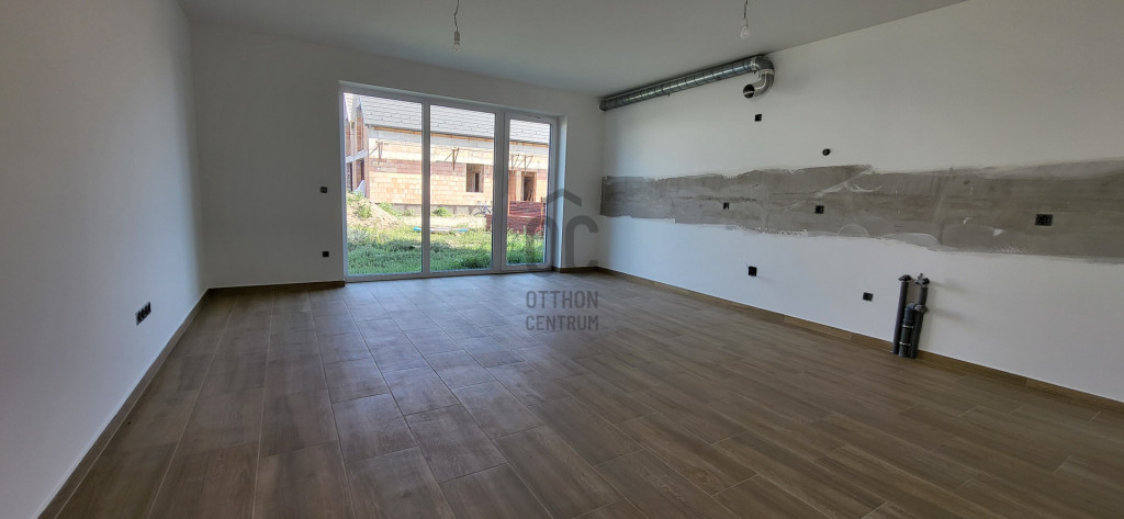 - 73 nm-es . Földszinten konyha-étkező, kertkapcsolatos nappali, tároló, fürdő+WC. Tetőtérben 2 háló , közlekedő, zuhanyzó+WC.