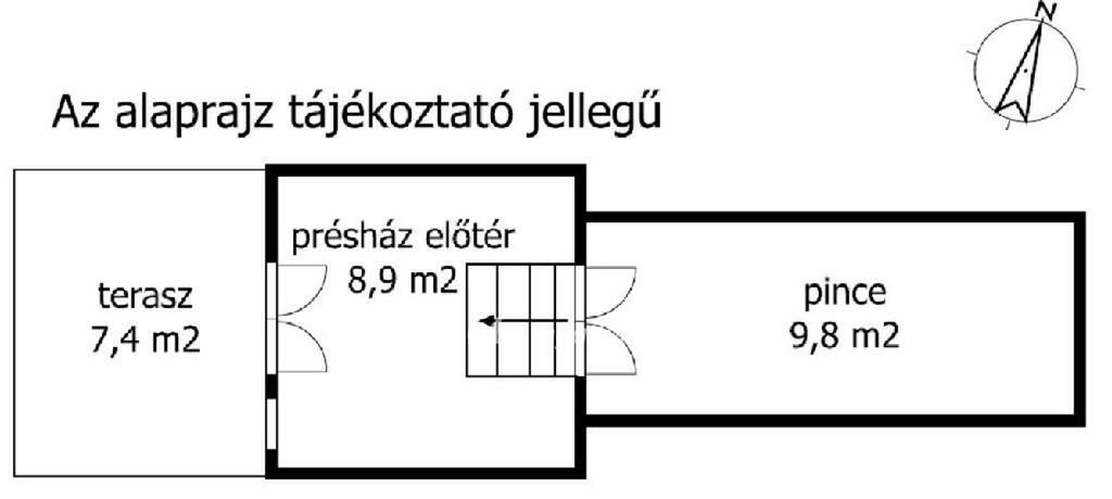 Az ingatlan része egy 32,5 m2-es présház borospincével, amelynek emeletén egy pihenőszoba található. Az épületben bevezetett villany és kályhás fűtés biztosítja az alapvető kényelmet, a vízellátás ásott kútból és esővízgyűjtéssel megoldott.