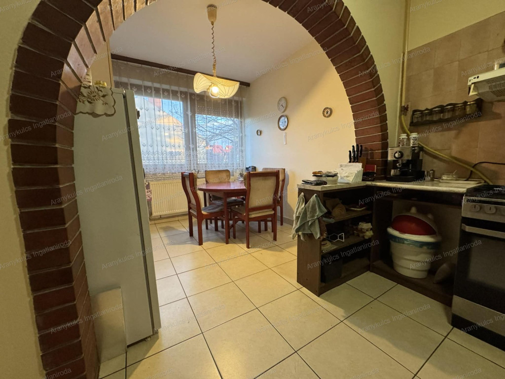 Gyulán, a város közkedvelt kertvárosi részén kínálunk eladásra egy 142,5 m²-es, kétszintes, tégla falazatú társasházi lakást, amelyhez 350 m²-es saját telekrész is tartozik. Az ingatlan kiváló választás lehet nagyobb családok számára is, hiszen tágas, jól átgondolt elrendezésének köszönhetően mindenki számára kényelmes életteret biztosít.A földszinten a bejáratot követően egy közlekedő fogad, innen nyílik két szoba, a konyha étkezővel, valamint egy fürdőszoba és külön WC. Az emeletre lépcső vezet, ahol további négy szoba, egy közlekedő, valamint egy fürdőszoba és külön WC került kialakításra, így akár nagycsaládosok, akár több generáció számára is ideális lehet az elosztás. A házhoz tartozik egy 11,4 m²-es terasz, amely kellemes helyszíne lehet a reggeli kávéknak vagy a nyári esti beszélgetéseknek, továbbá egy 19,5 m²-es garázs és tároló is, amely praktikus megoldást nyújt parkolásra és tárolásra egyaránt.