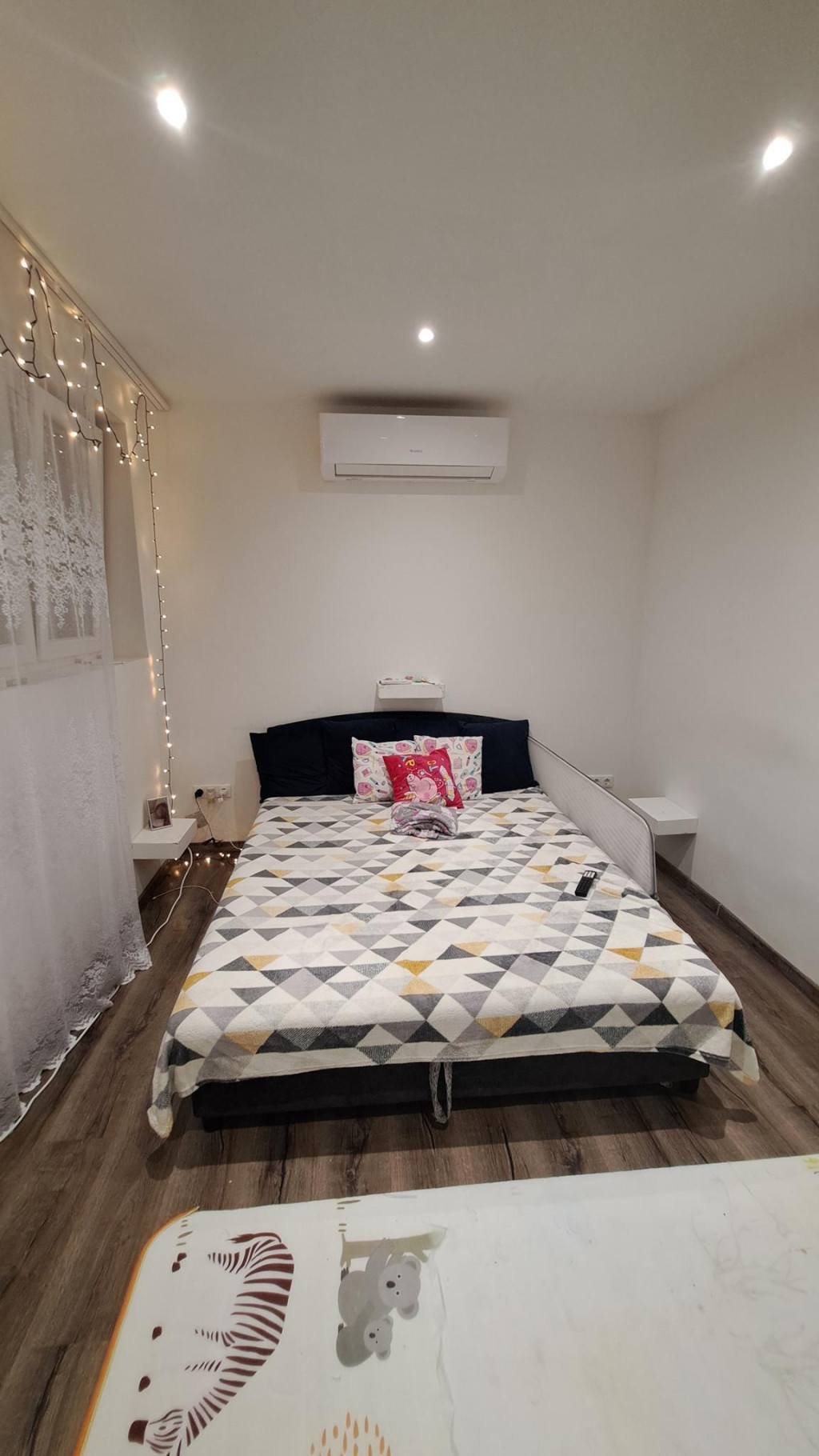 A fűtést H tarifás klíma biztosítja, a meleg víz ellátás villanybojlerrel megoldott. A beépített szekrények és a rejtett világítás a kényelmet szolgálják.