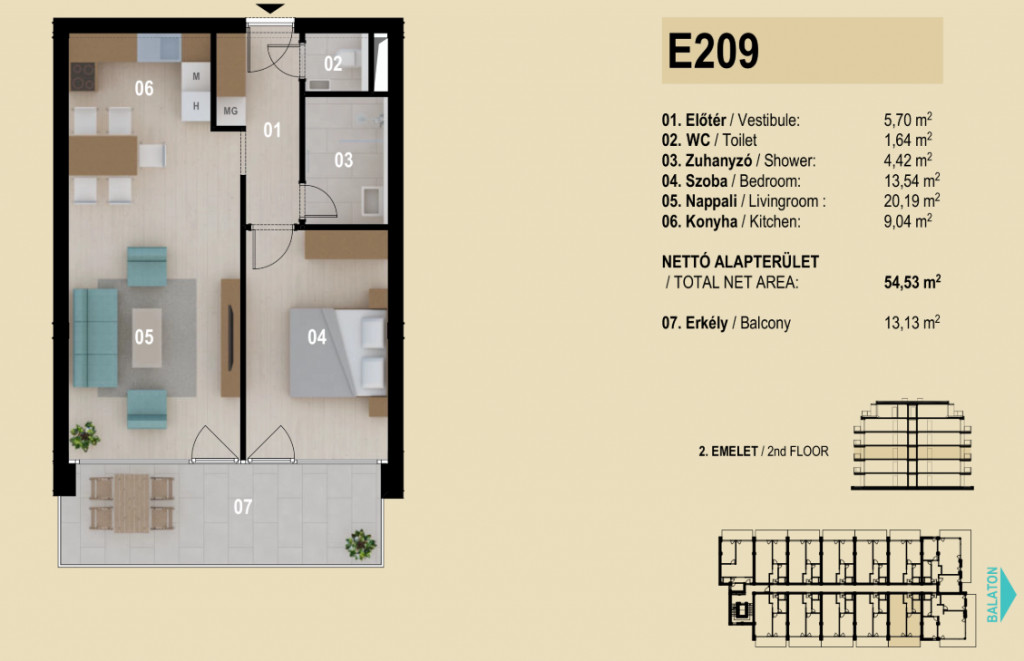 53-100 m2 közötti alapterületekkel, élhető erkélyekkel, földszinti kertkapcsolattal, tetőterén exkluzív panorámás tetőteraszokkal kínáljuk őket. Magas minőség, szigetelés, biztonsági üveg, antracit színű nyílászárók, fűtést-hűtést biztosító hőszivattyús rendszer, gyermekjátszótér, kültéri medence , épület előtt 3 km hosszú szabadstrand, parti sétányok várják a ház új lakóit.