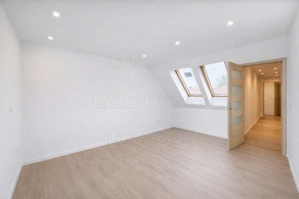 A kétszintes, mindössze négy lakásos épület tetőtéri lakása ideális méretű és elrendezésű: