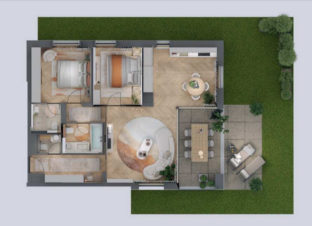 -Földszinti, 2 szoba+nappalis lakás, 2 fürdőszobával, 11,25 m2-es loggiaval, 16 m2 terasszal, 60 m2 saját használatú kertrésszel.
