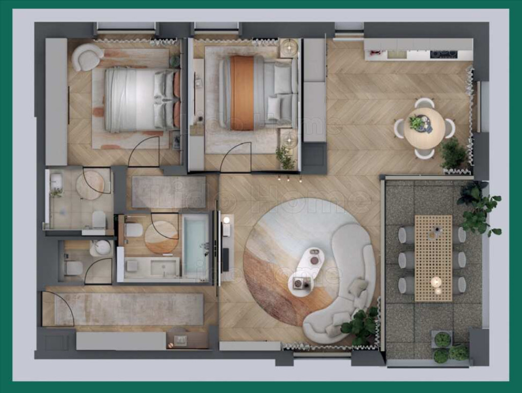 -1. emeleti, 2 szoba+nappalis lakás, 2 fürdőszobáva, 12,53 m2-es loggiaval.
