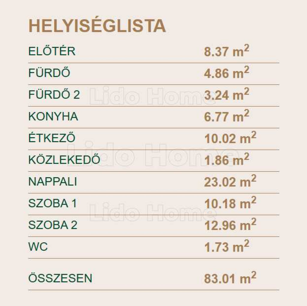 -1. emeleti, 2 szoba+nappalis lakás, 2 fürdőszobával, 9,64 m2-es loggiaval.