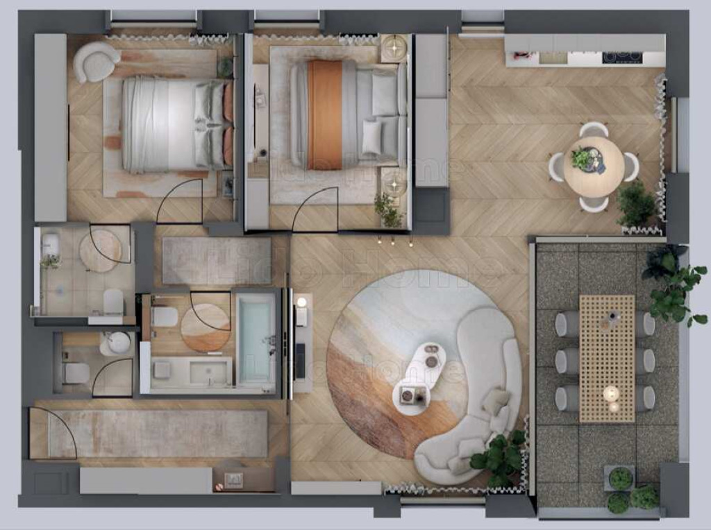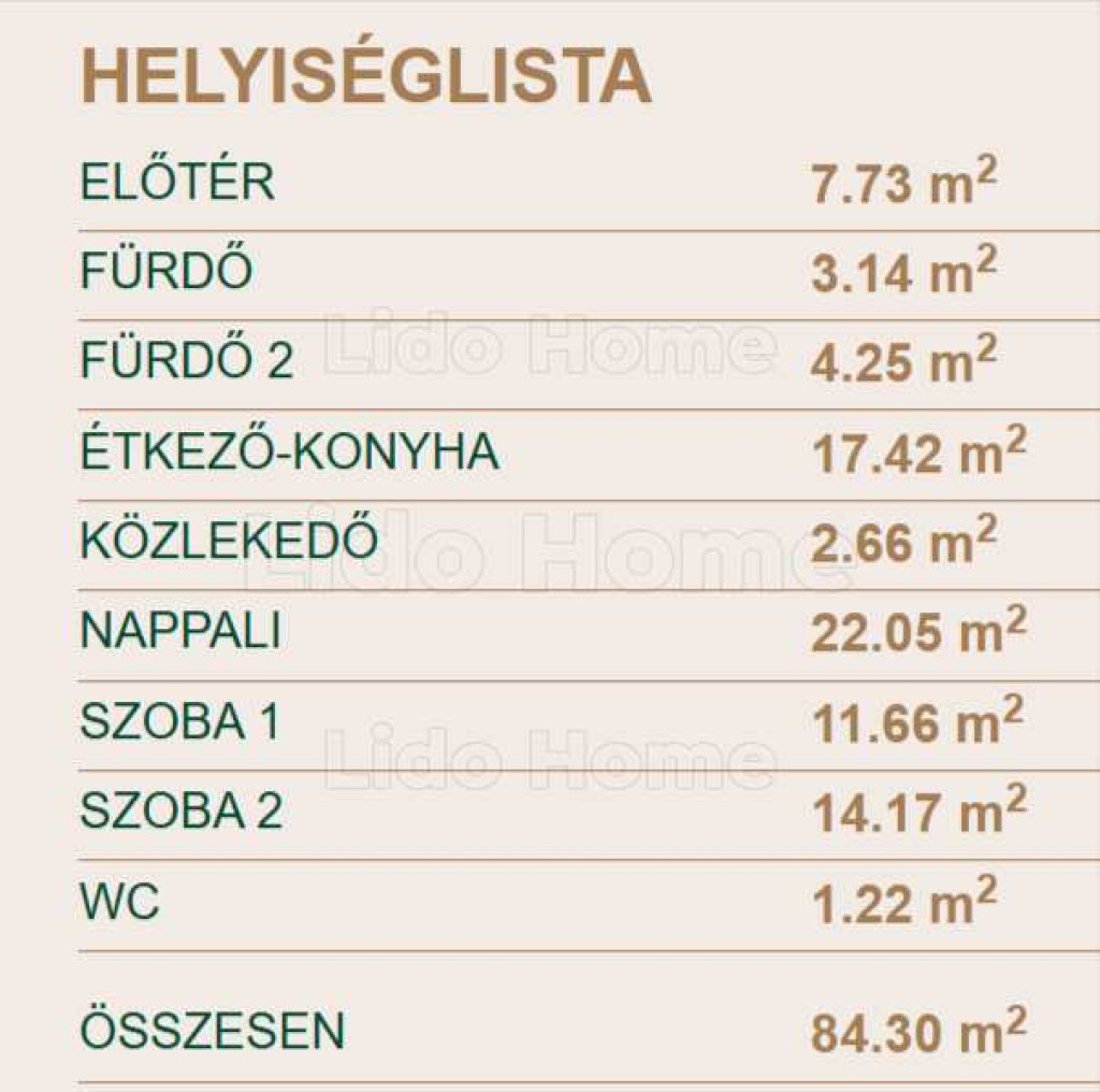 -2. emeleti, 2 szoba+nappalis lakás, 2 fürdőszobáva, 12,53 m2-es loggiaval.