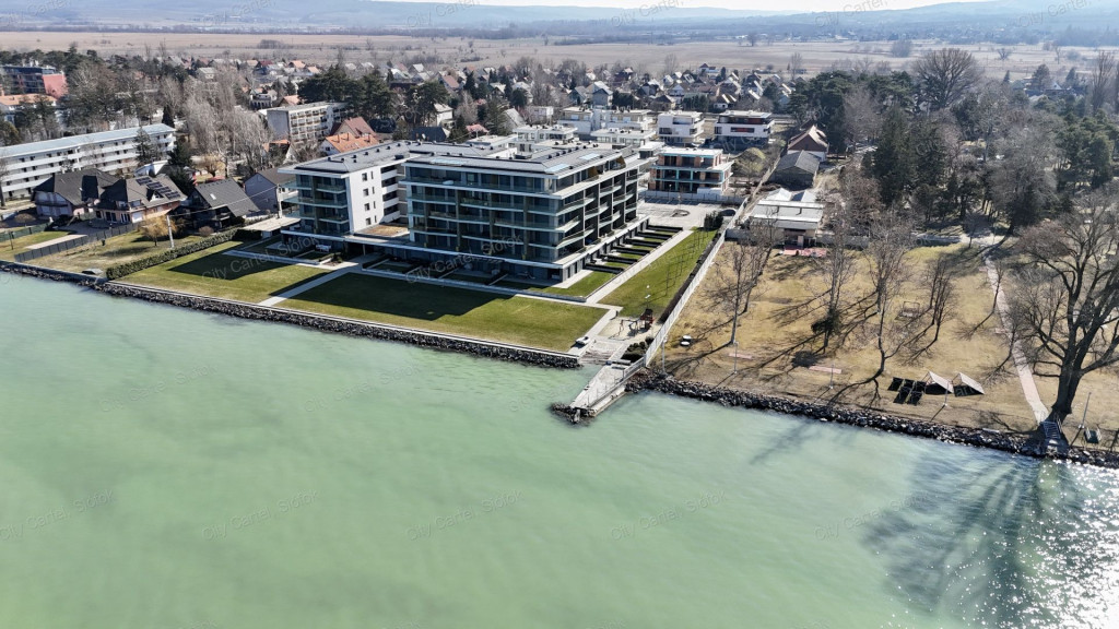 Balatoni panorámás, kizárólagos kertkapcsolattal, dupla gépkocsibeállóval rendelkező, vízparti utcában található társasházi lakás.