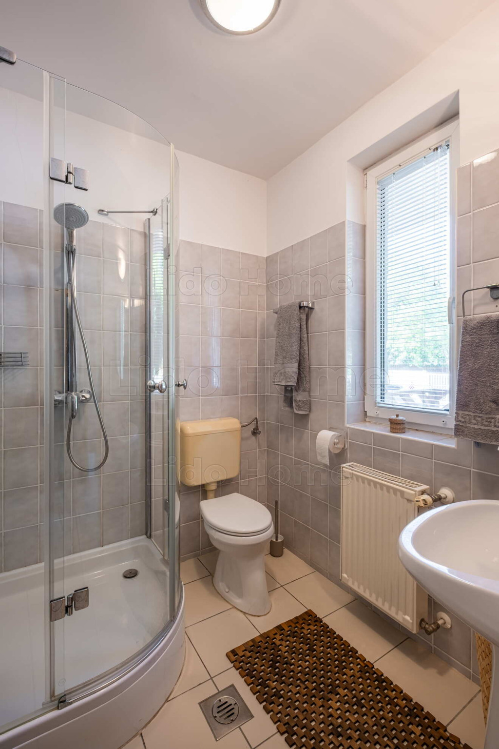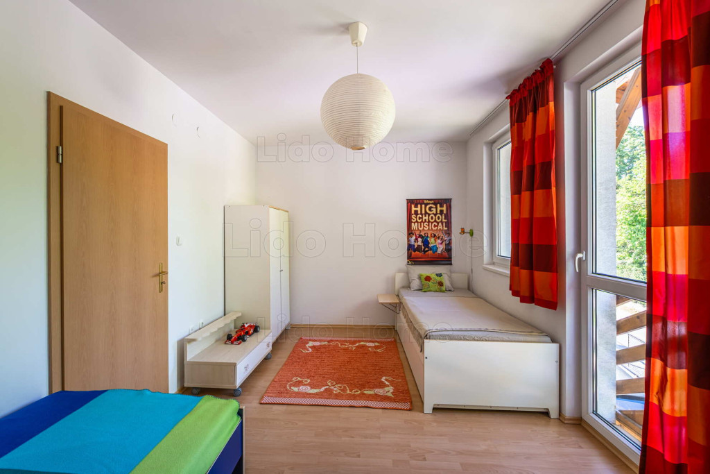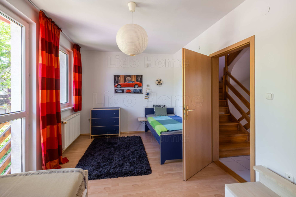 Az emeleten két kényelmes méretű, külön nyíló szoba található, amelyek hálószobaként, gyerekszobaként vagy dolgozószobaként egyaránt jól hasznosíthatók. Ezen a szinten egy káddal és WC-vel felszerelt fürdőszoba is rendelkezésre áll. Az egyik szobából megközelíthető, 12 m²-es erkély kellemes kilátást biztosít, és további lehetőséget teremt a nyugodt kikapcsolódásra.