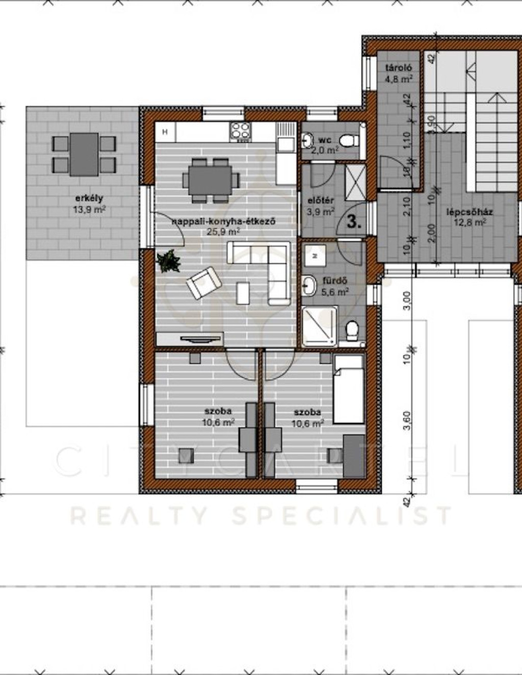A lakás praktikus elosztása és a tágas erkély kiváló lehetőséget nyújt pihenésre, családi életre vagy akár vendégfogadásra is.