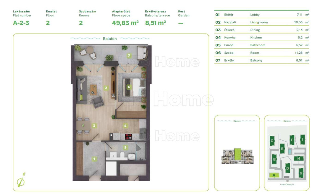 A 2.emeleti, északi tájolású lakás hasznos alapterülete: 49,83 m2, a hozzá tartozó terasz: 8,51 m2.