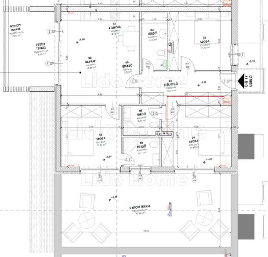 - 95 m2 terület + 7 m2 fedett terasz + 54 m2 nyitott terasz,