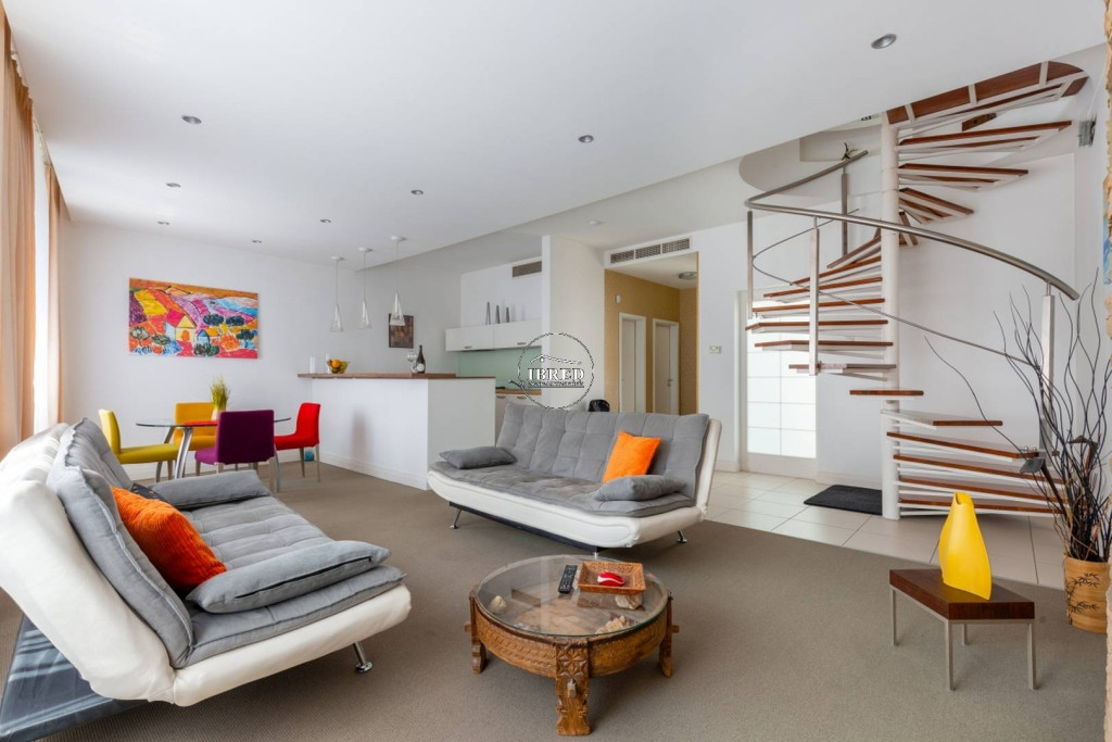 A felső szintre vezető stílusos csigalépcső a nagyméretű hálószobához vezet, amely közvetlen kapcsolatban áll a lenyűgöző, 32 m²-es panorámás terasszal.