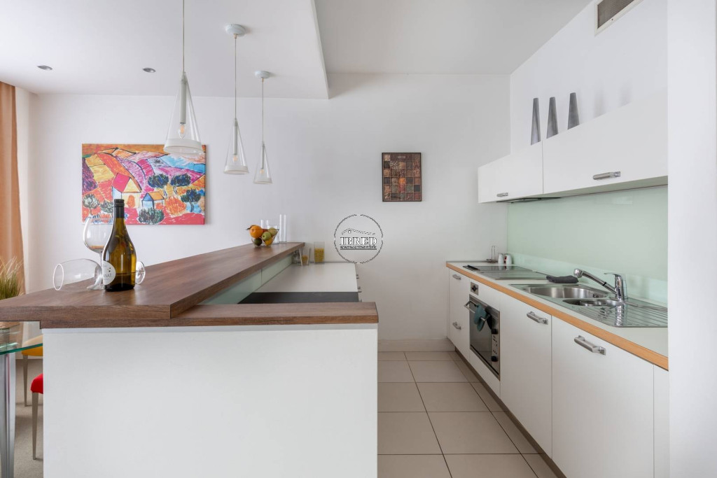 Az alsó szinten tágas, amerikai konyhás nappali fogadja a látogatókat, amelyhez fürdőszoba, gardrób és háztartási helyiség is tartozik. A felső szintre vezető stílusos csigalépcső a nagyméretű hálószobához vezet, amely közvetlen kapcsolatban áll a lenyűgöző, 32 m²-es panorámás terasszal. Az ingatlan kelet-nyugati tájolásának köszönhetően egész nap világos és napfényes.
