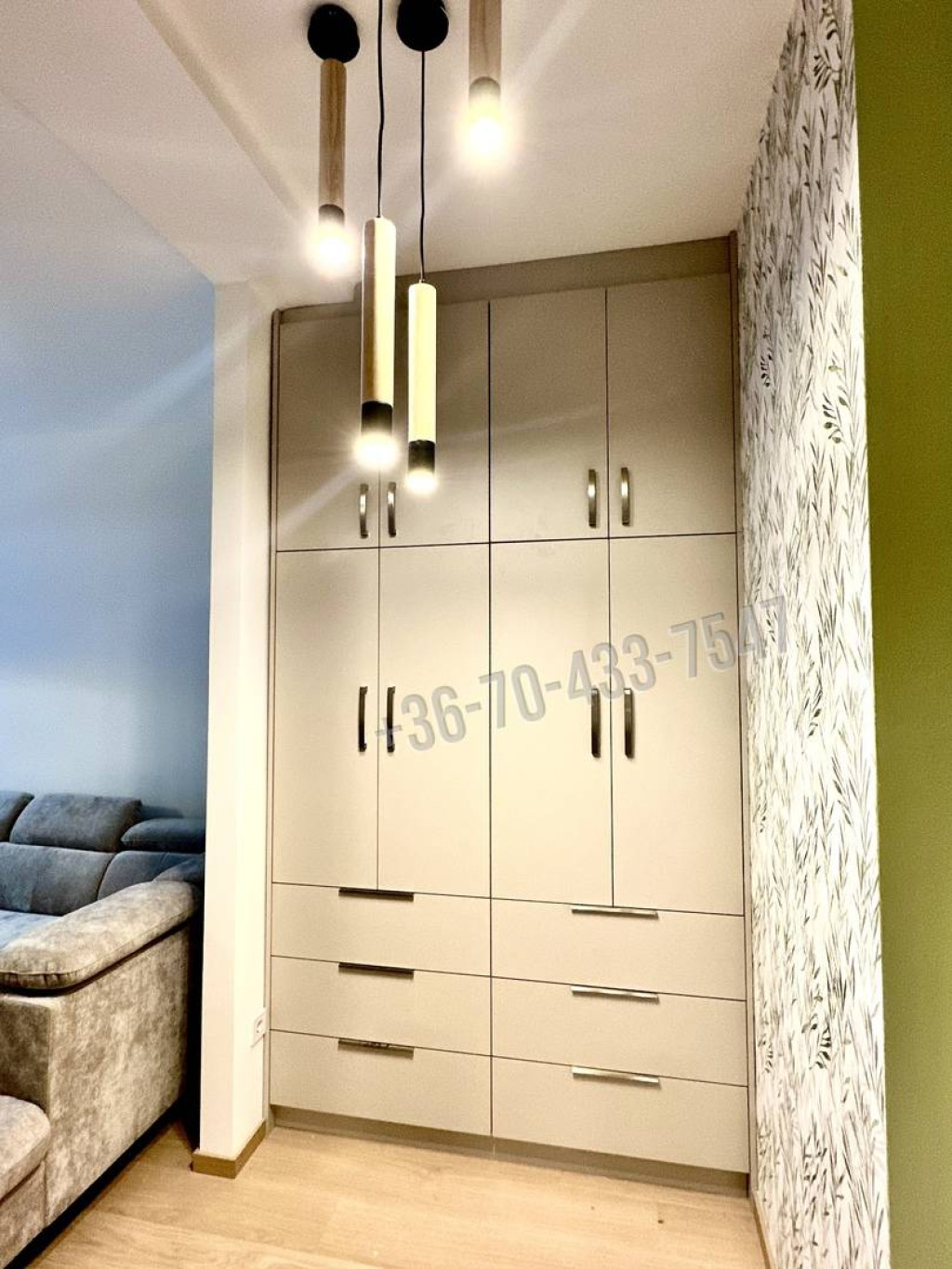 Egyedileg, méretre gyártott, mennyezetig érő gardróbszekrény.