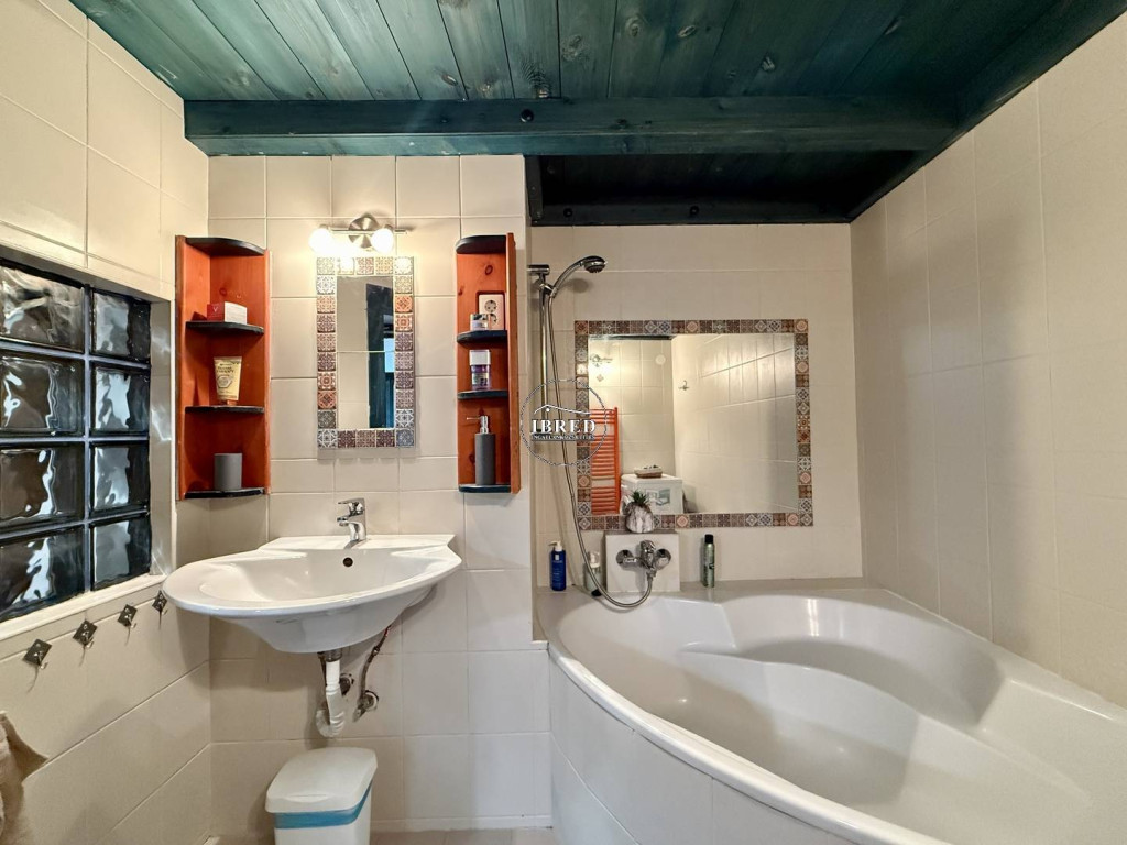 – különálló mosdó és egy sarokkáddal felszerelt, ízléses fürdőszoba alkotják a belső teret.