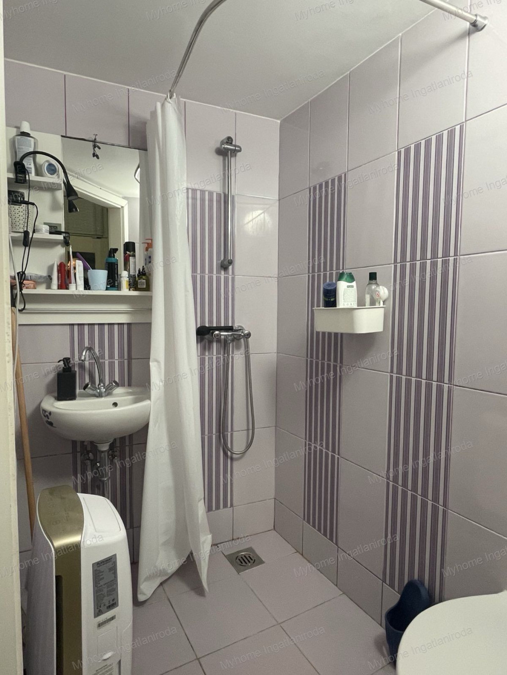 -A fürdőszoba letisztult, zuhanyzós kialakítású, könnyen karbantartható burkolatokkal.
