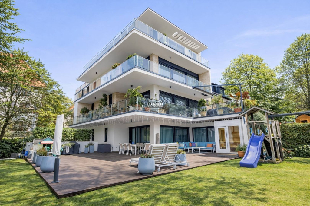 RITKASÁG AZ INGATLANPIACON – 2017-ben épült, újszerű állapotú, 163 nm nettó alapterületű, nappali + 4 szobás, exkluzív kertkapcsolatos lakás, hatalmas terasszal, dupla garázzsal és tárolóval eladó!A II. kerület egyik legnívósabb, elegáns, hegyvidéki részén, 1122 nm-es, sík, gondozott, automata öntözőrendszerrel ellátott telken álló, négy lakásos, liftes, minimál stílusú társasház földszintjén kínálunk megvételre egy valóban különleges adottságú otthont.