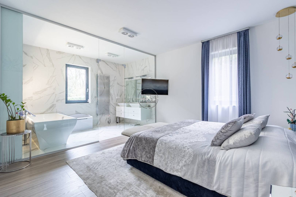 Itt kapott helyet egy nagyméretű hálószoba saját fürdőszobával, dupla mosdóval és szabadon álló káddal.