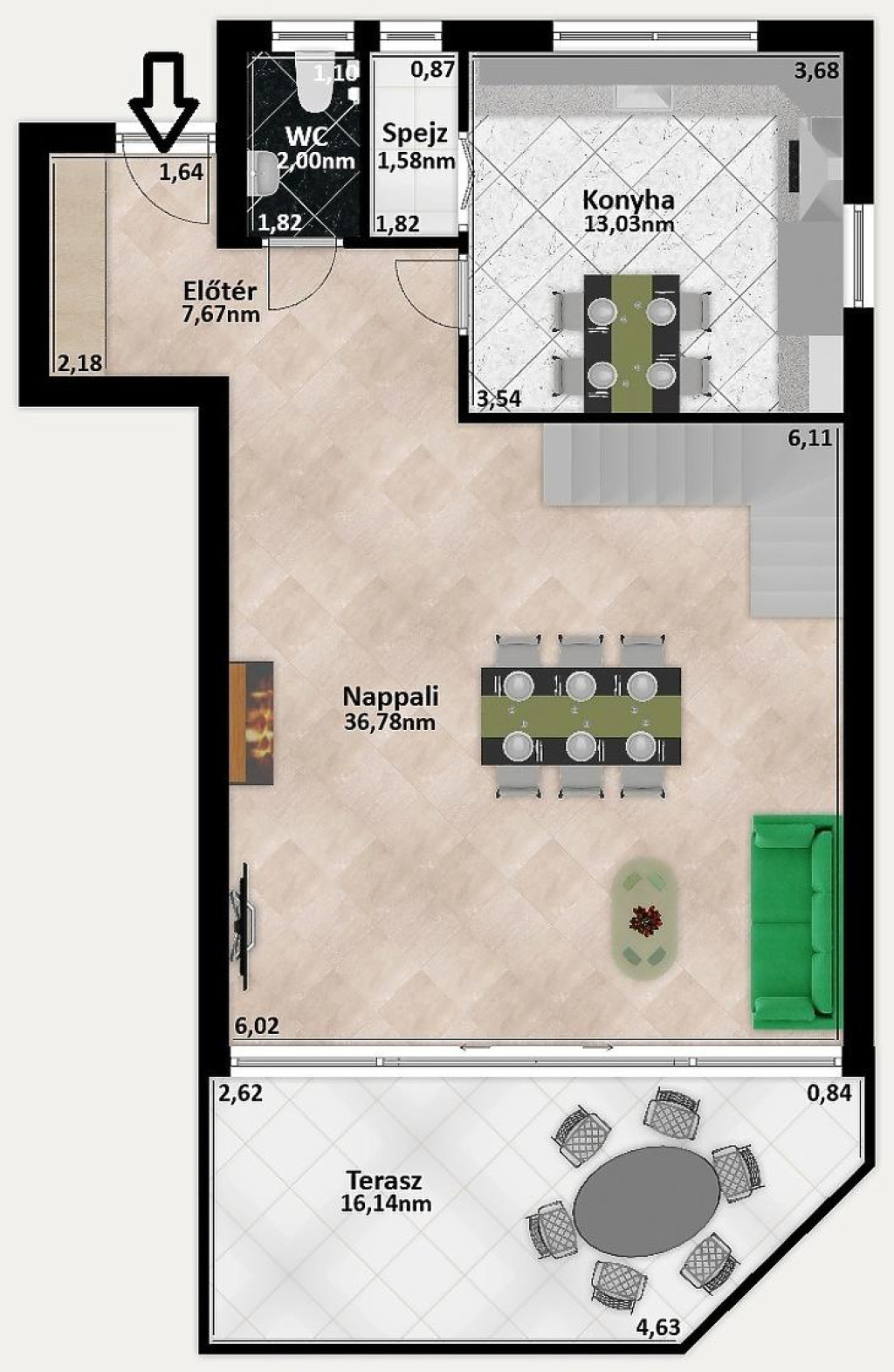 A földszinten helyezkedik el a lakás központi része, mely elsősorban a hatalmas nappali, közvetlen terasz kapcsolattal, ahonnan gyönyörű kilátásban részesülhetünk Jánoshegy irányába. Szintén ezen a szinten található a nagy méretű konyha, spejz, egy külön wc és egy előtér.