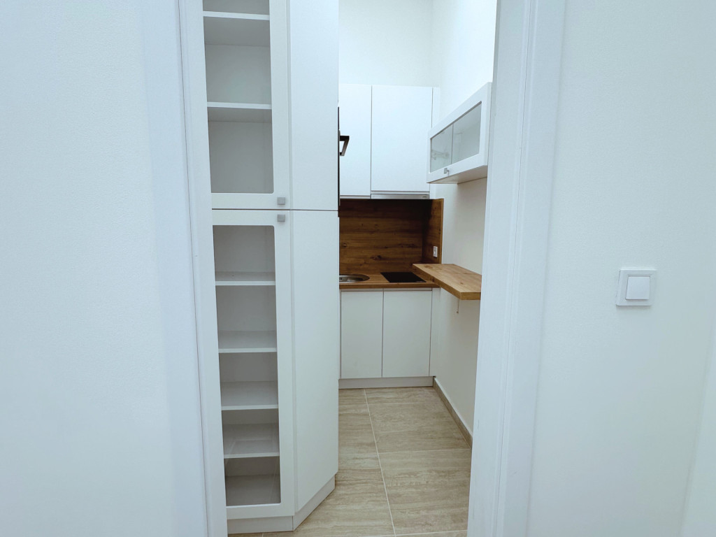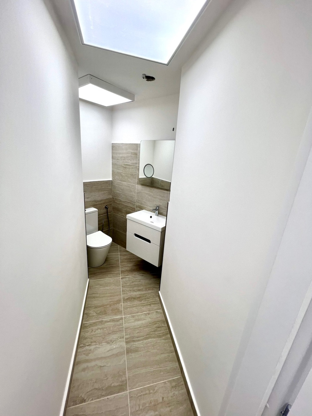 A beépített, gépesített konyha elegánsan illeszkedik a térbe, míg az elrendezés lehetőséget biztosít akár egy második, teljes értékű fürdőszoba kialakítására is.