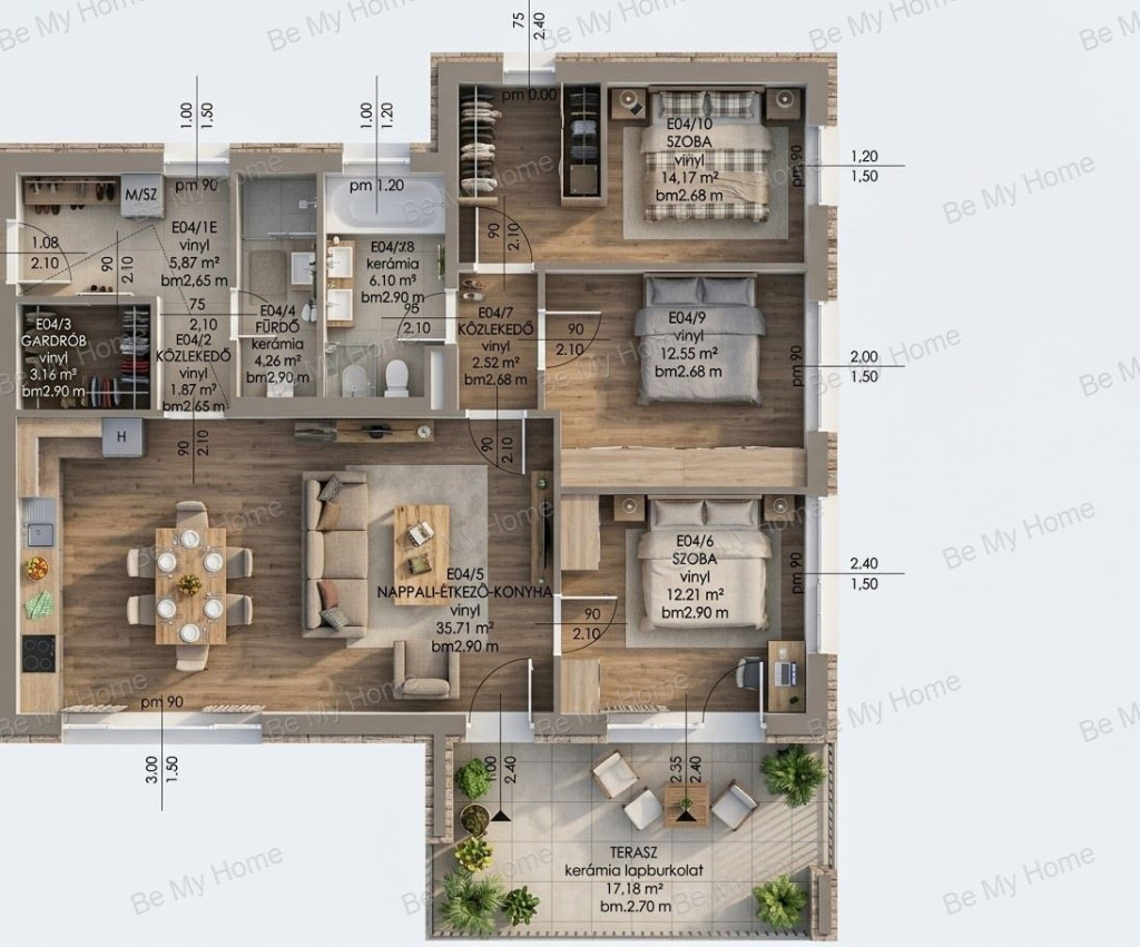 4, lakás: Nappali+ 3 hálószoba, nettó 98nm, 17nm terasz, délkeleti fekvés, duplakomfort.