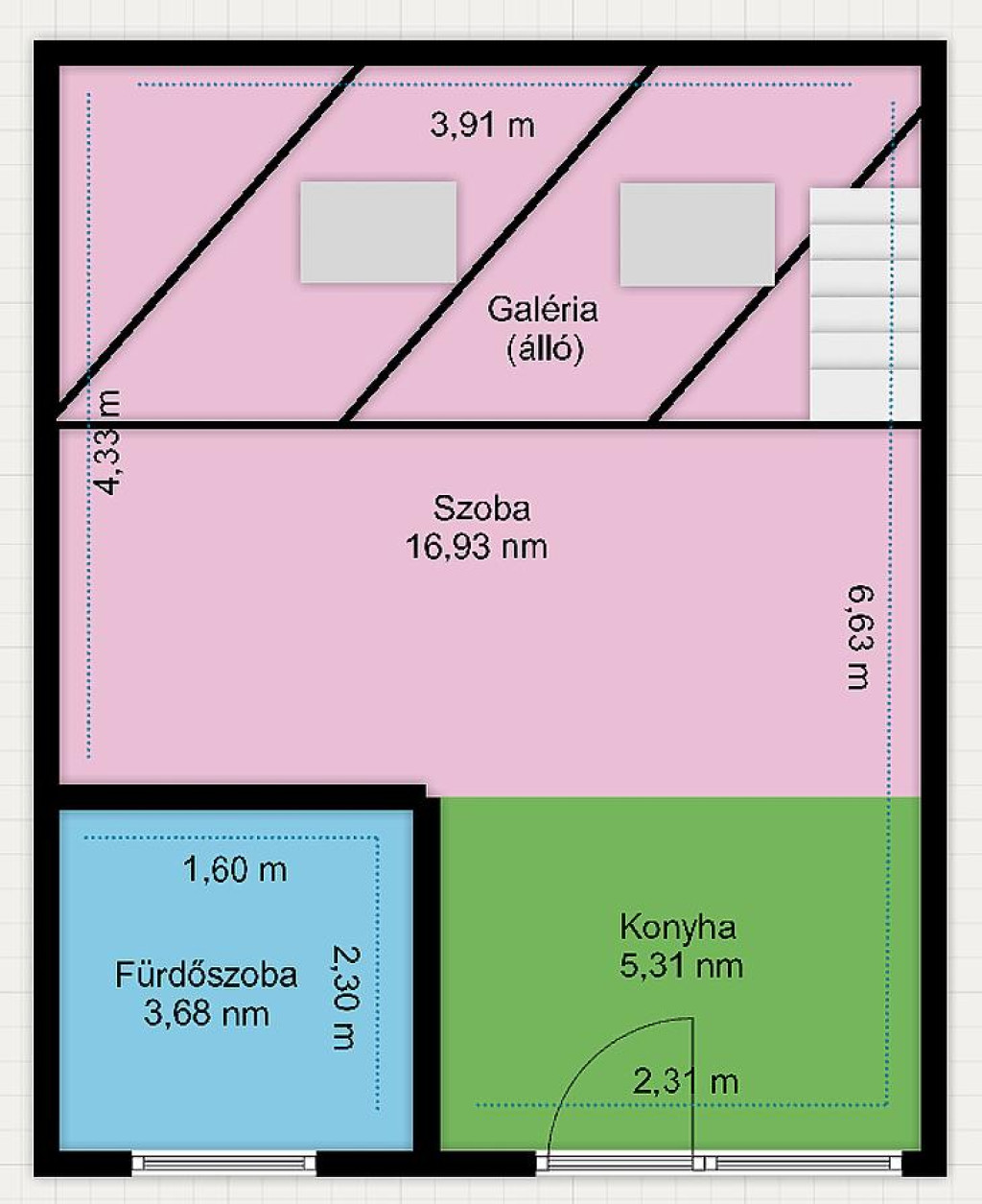 Belmagasságának köszönhetően a hasznos alapterületet ( 4,5 nm-es álló) galéria kialakításával növelték.