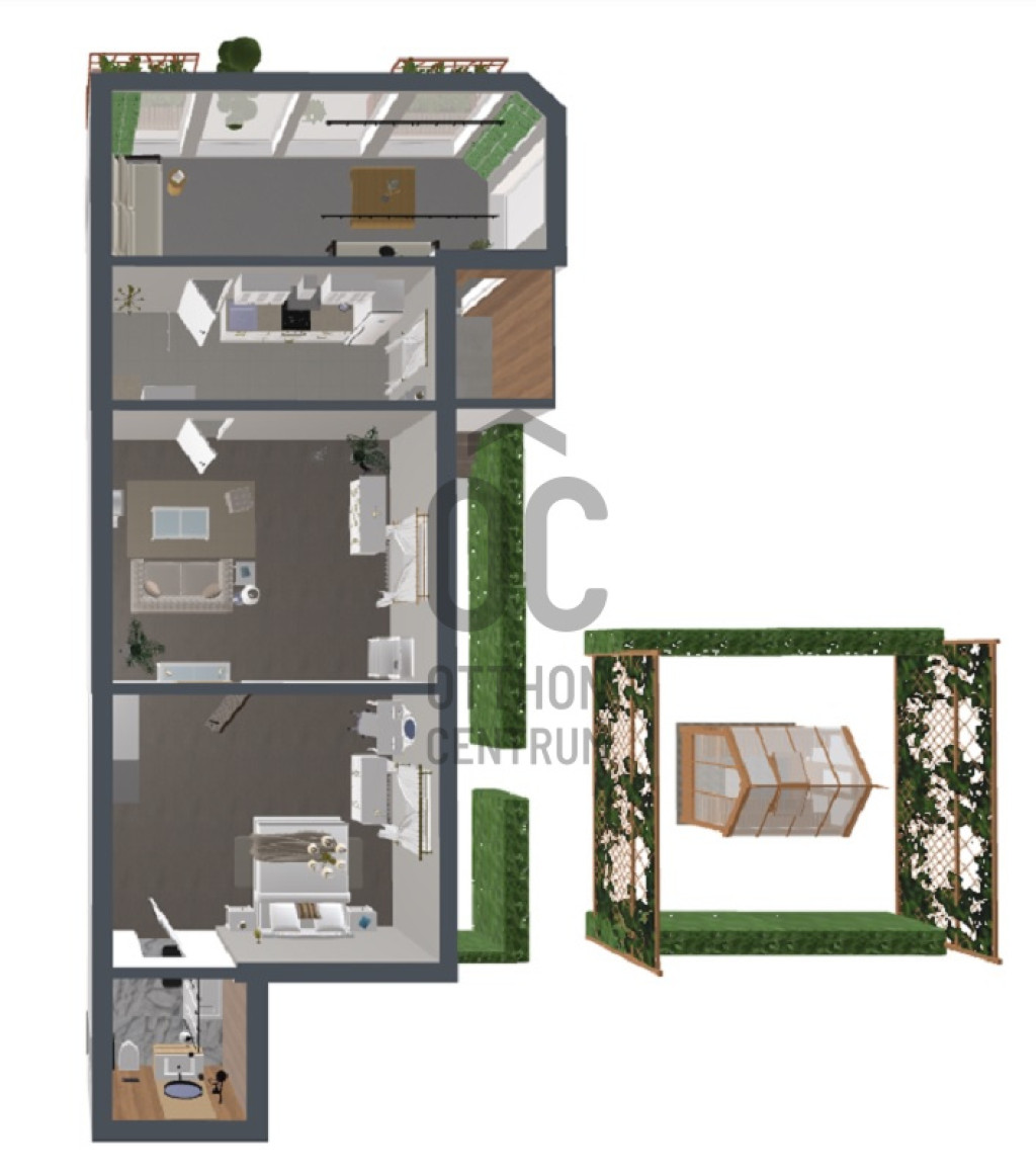 Az ingatlan különlegessége a közvetlen kertkapcsolat, valamint a zárt udvarban kialakított fedett gépkocsibeálló, ami a környéken nagy értéknek számít.