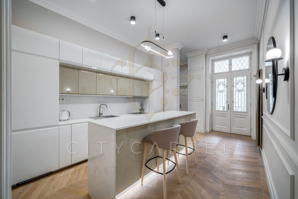 Budapest egyik legkeresettebb, történelmi belvárosi utcájában kínáljuk megvételre ezt a 105 nm-es, teljes körűen felújított, luxus kivitelű lakást, amely minden részletében az igényességet és az időtálló eleganciát képviseli.