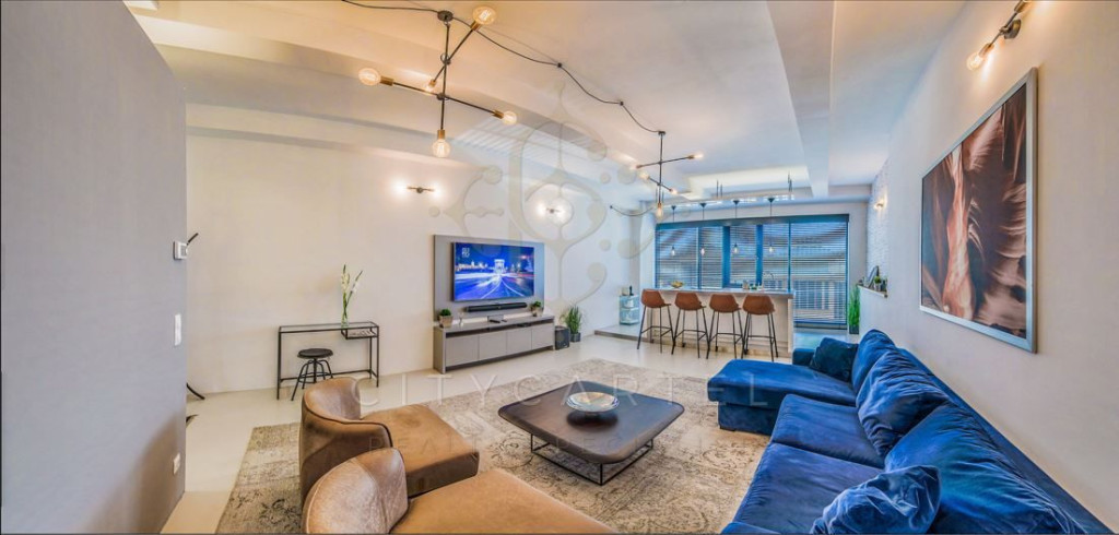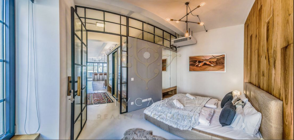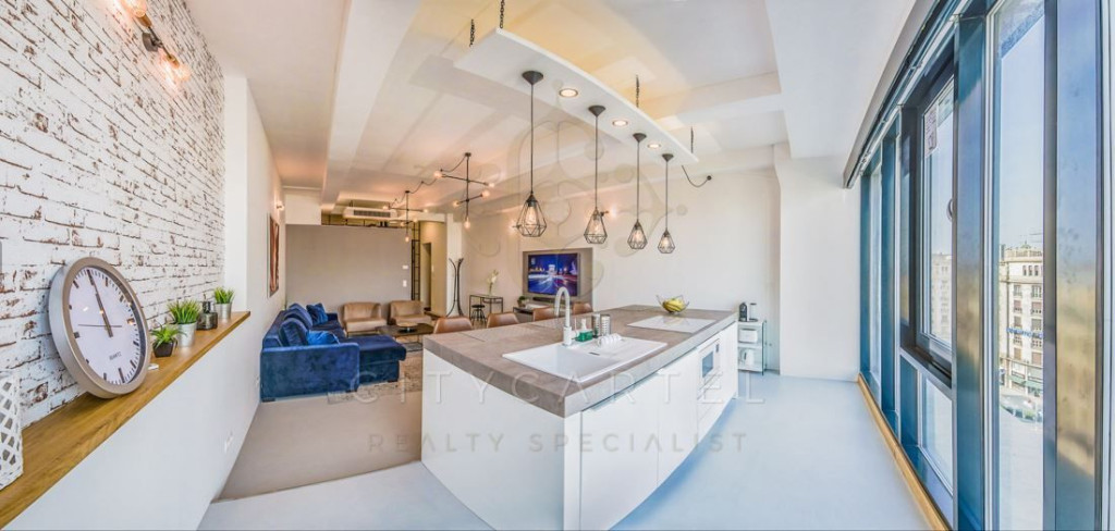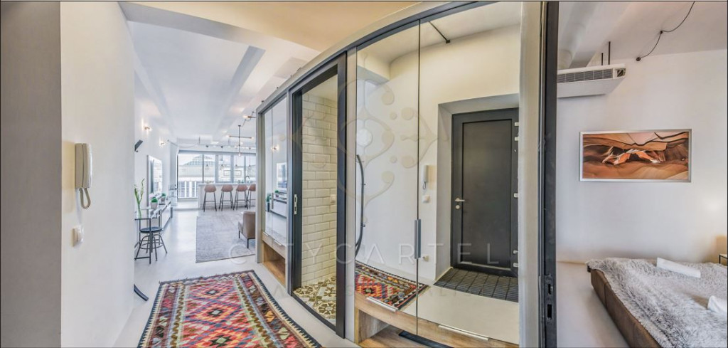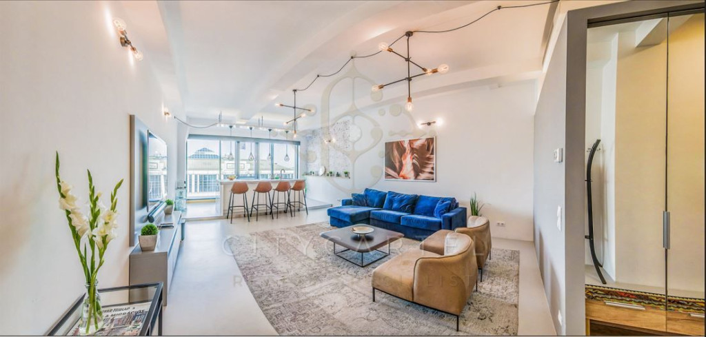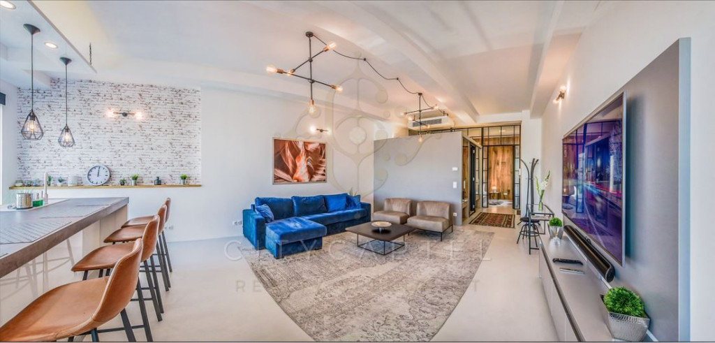 Eladó egy 70 nm-es, egyedi stílusban kialakított loft lakás Budapest belvárosában, az V. kerület egyik impozáns műemlék épületének hatodik emeletén.