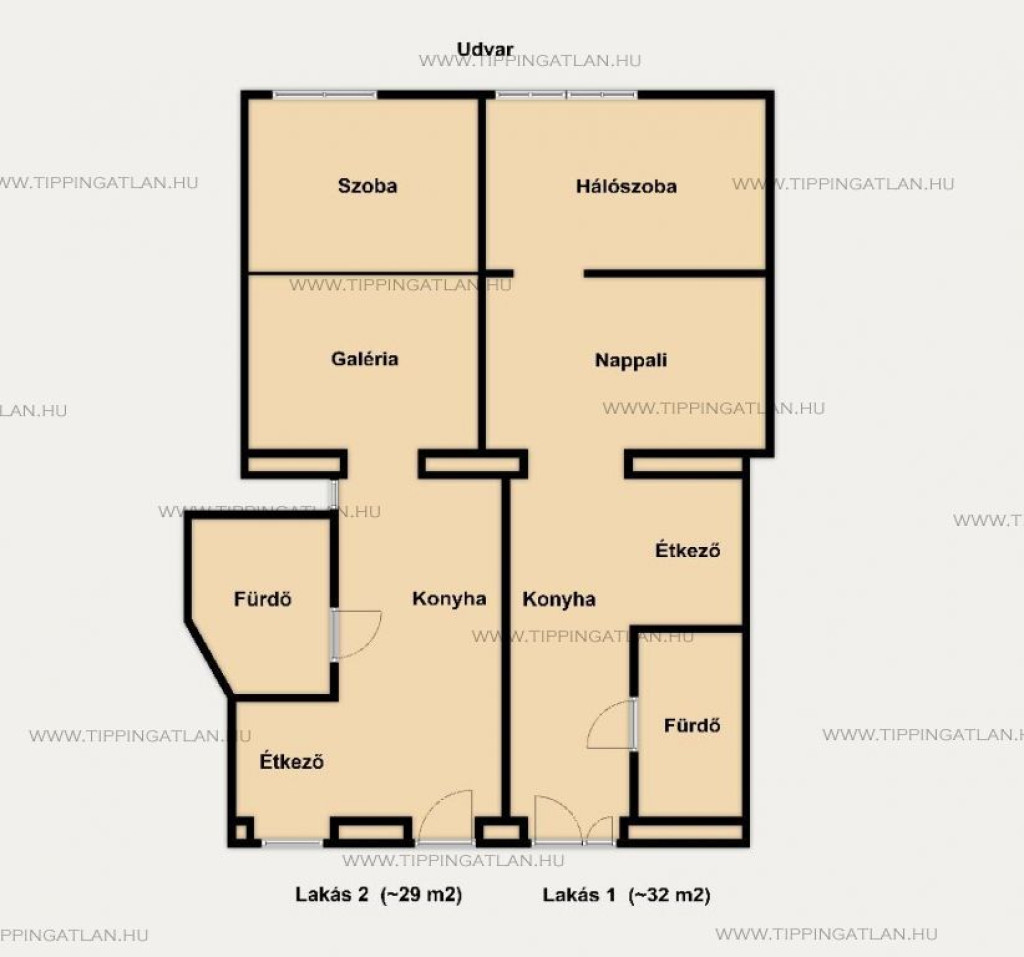 FONTOS: A két lakás közül csak az egyik (32 m2-s) rendelkezik önálló villanyórával, a másik lakás csak almérővel működik!
