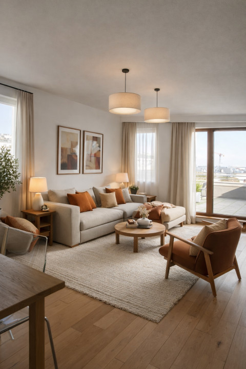 Spacious living room with dining area and direct terrace access