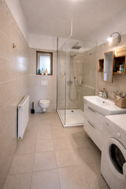 A lakás világos, modern stílusú, fa parkettával és minőségi burkolatokkal.
