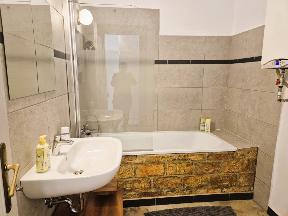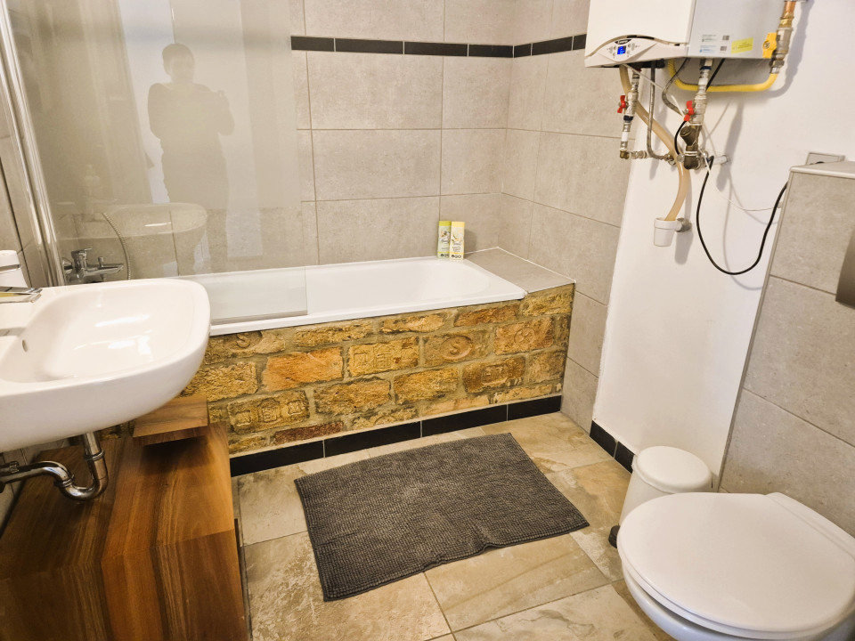 A szaniterek, csempe - burkolat kitűnő állapotban , felújítást nem igenyel.