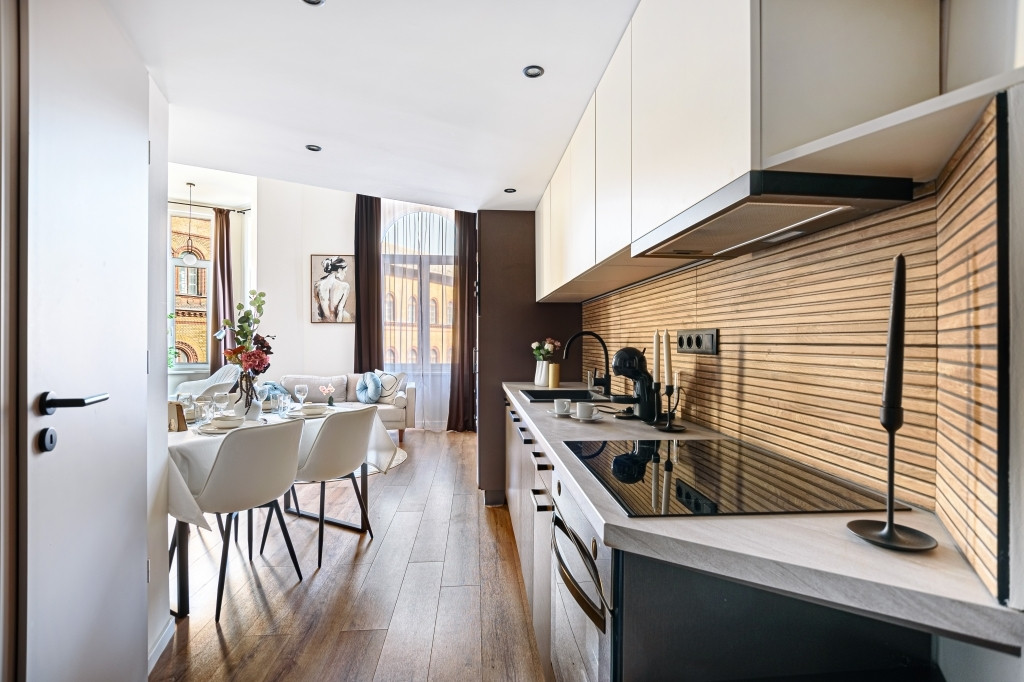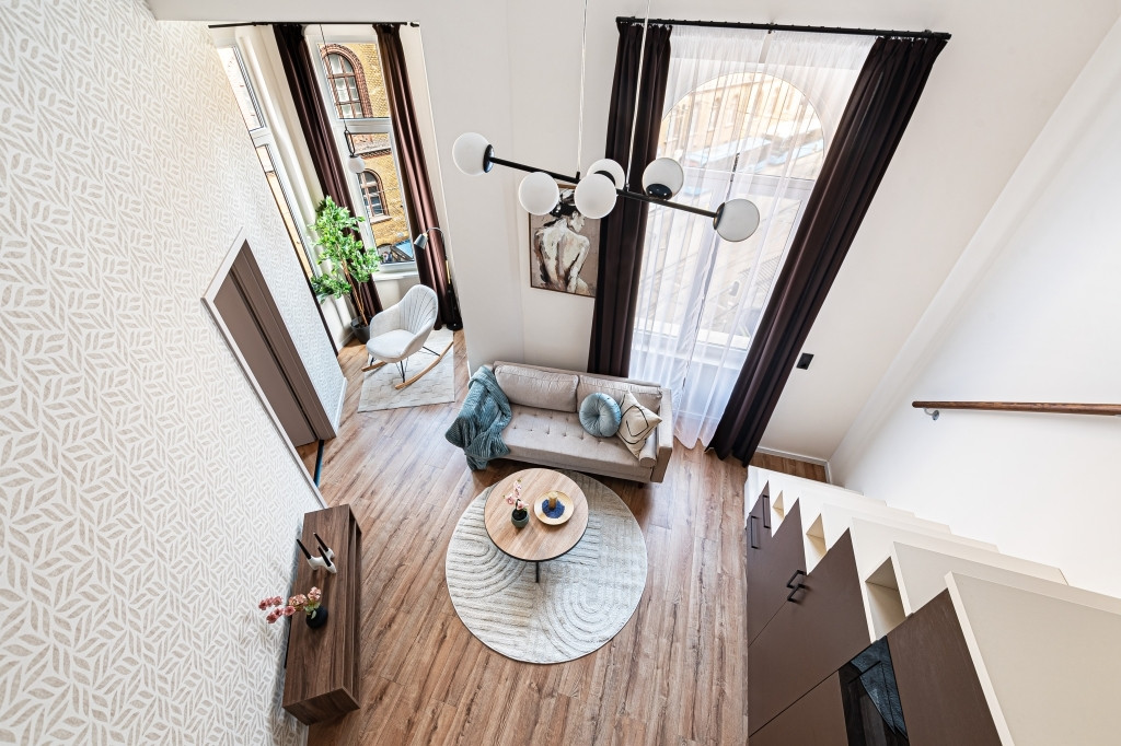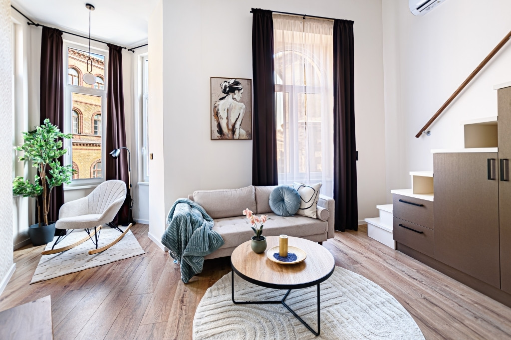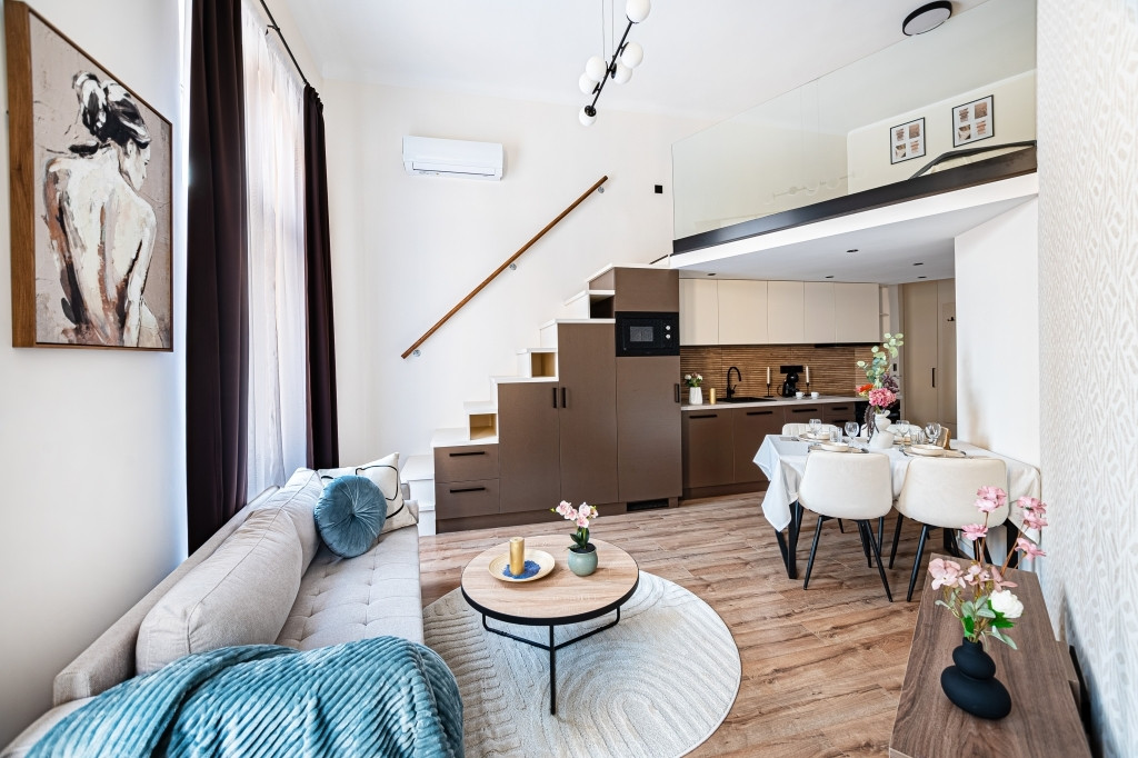 Az ingatlan teljes körűen felújított, modern kialakítású terekkel rendelkezik, design bútorokkal berendezve. A bejáraton túl egy 3,8 nm-es, közös használatú előtérből nyílik a lakás. A nappali a sok ablaknak és a keleti tájolásnak köszönhetően rendkívül világos. A gépesített konyha a mindennapi használatot maximálisan kiszolgálja, a fűtésről és hűtésről korszerű hűtő-fűtő klíma gondoskodik. A vadonatúj ajtók, valamint a hő- és hangszigetelt, nyílászárók nyugodt, komfortos lakókörnyezetet és napfényes belsőt teremtenek a belvárosi elhelyezkedés ellenére is. A nappaliban a fürdőszoba felett egy hálóként funkcionáló, 170 cm magas, 10 nm-es gyönyörű galéria került kialakításra nagy tárolókapacitású szekrényekkel és egy franciaággyal.