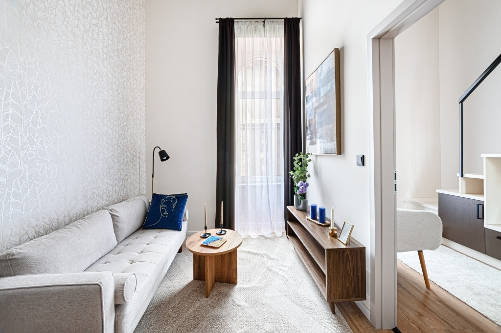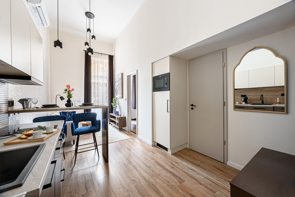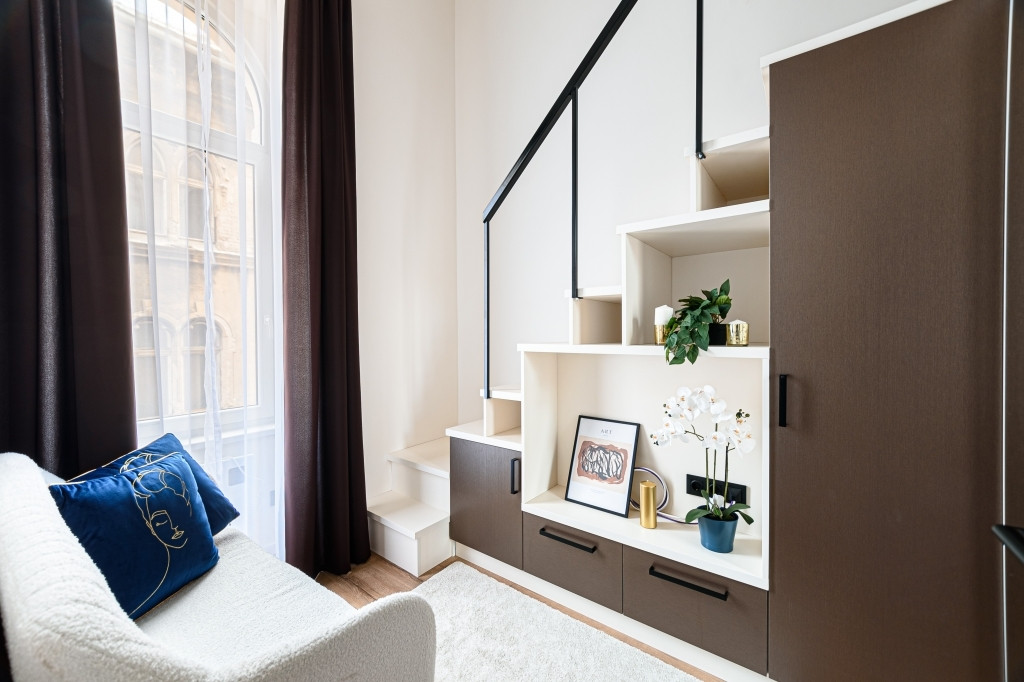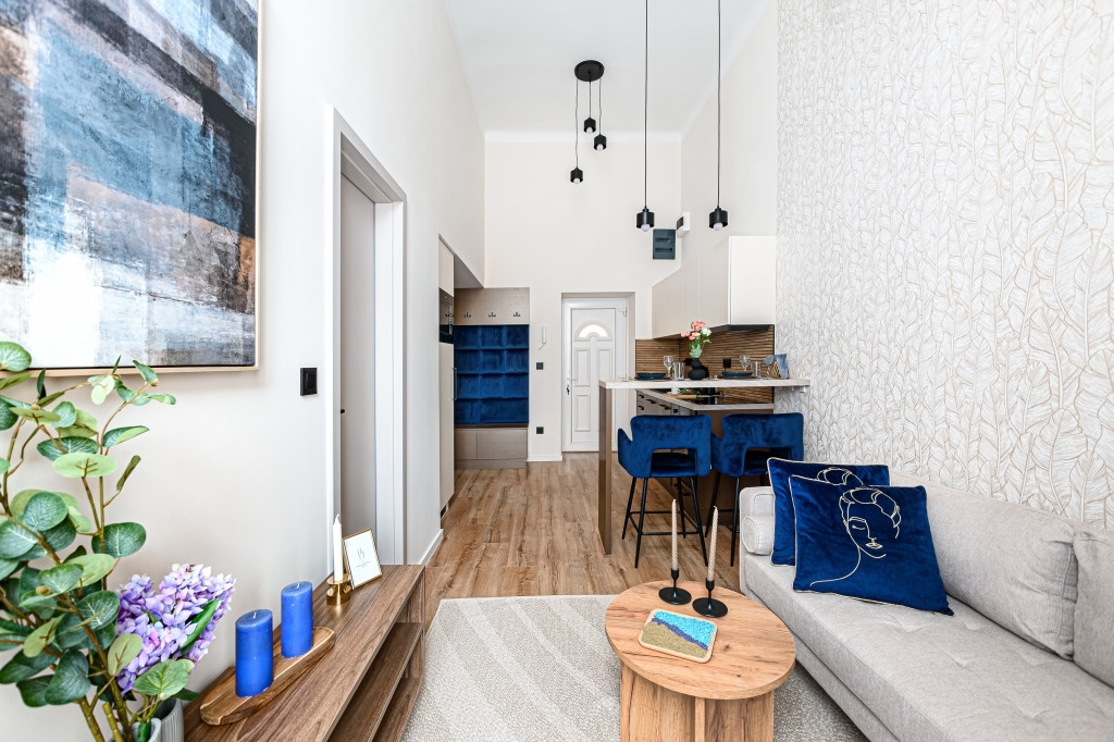 Az ingatlan teljes körűen felújított, modern kialakítású terekkel rendelkezik, design bútorokkal berendezve. A bejáraton túl egy 3,8 nm-es, közös használatú előtérből nyílik a lakás. A nagy ablakoknak és a keleti tájolásnak köszönhetően rendkívül világos. A gépesített konyha a mindennapi használatot maximálisan kiszolgálja, a fűtésről és hűtésről korszerű hűtő-fűtő klíma gondoskodik. A vadonatúj ajtók, valamint a hő- és hangszigetelt, nyílászárók nyugodt, komfortos lakókörnyezetet és napfényes belsőt teremtenek a belvárosi elhelyezkedés ellenére is. A kisebbik szobában a fürdőszoba felett egy hálóként funkcionáló, 170 cm magas, 7 nm-es gyönyörű galéria került kialakításra nagy tárolókapacitású szekrényekkel és egy franciaággyal.