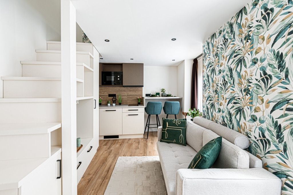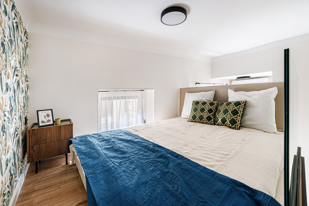 Az ingatlan teljes körűen felújított, modern kialakítású terekkel rendelkezik, design bútorokkal berendezve. A bejáraton túl egy 3,8 nm-es, közös használatú előtérből nyílik a lakás. A nagy ablakoknak és a nyugati tájolásnak köszönhetően világos. A gépesített konyha a mindennapi használatot maximálisan kiszolgálja, a fűtésről és hűtésről korszerű hűtő-fűtő klíma gondoskodik. A vadonatúj ajtók, valamint a hő- és hangszigetelt, nyílászárók nyugodt, komfortos lakókörnyezetet és napfényes belsőt teremtenek a belvárosi elhelyezkedés ellenére is. A szobában a fürdőszoba felett egy hálóként funkcionáló, 170 cm magas, 7 nm-es gyönyörű galéria került kialakításra nagy tárolókapacitású szekrényekkel és egy franciaággyal.