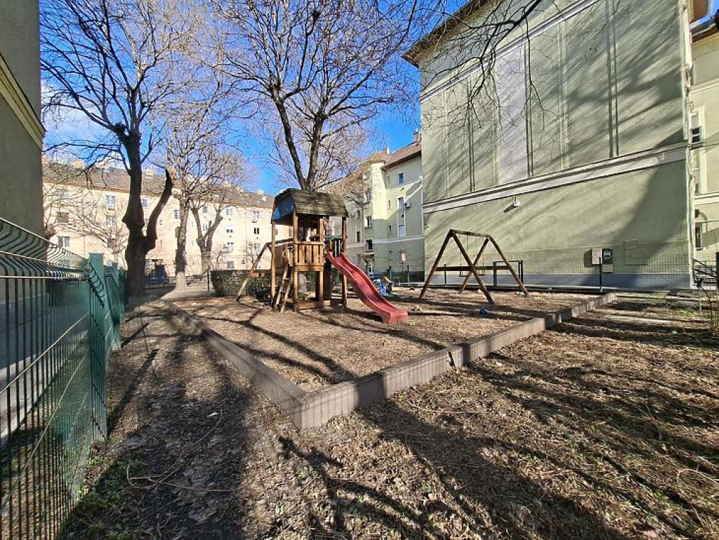 A társasház rendezett, saját, zárt belső kerttel rendelkezik, ahol játszótér és parkolási lehetőség is megtalálható – ideális választás kisgyermekes családoknak vagy akár befektetés céljára is.