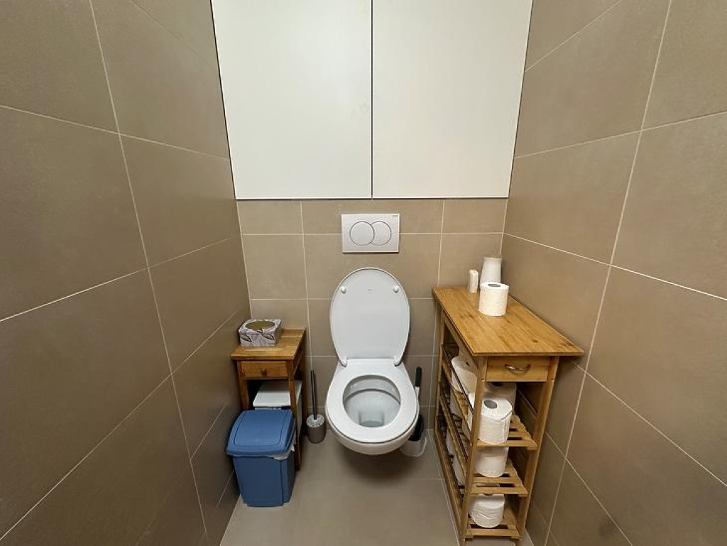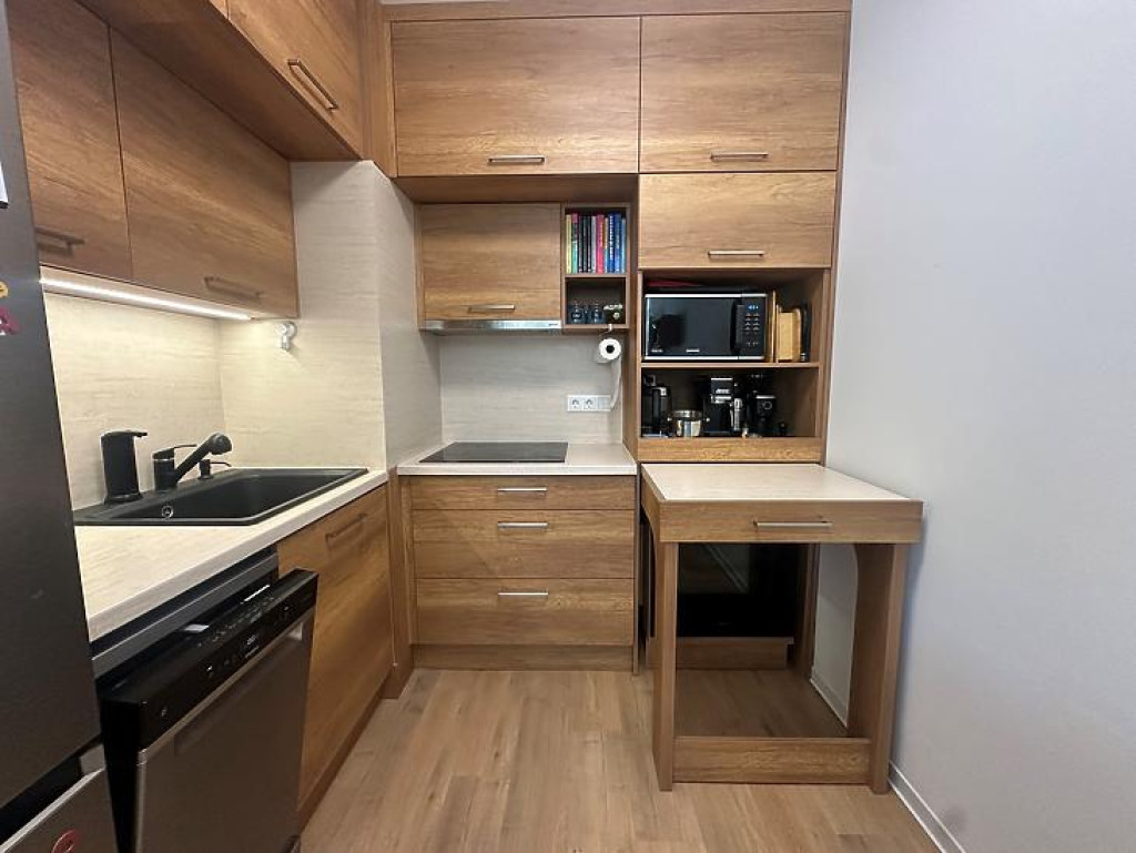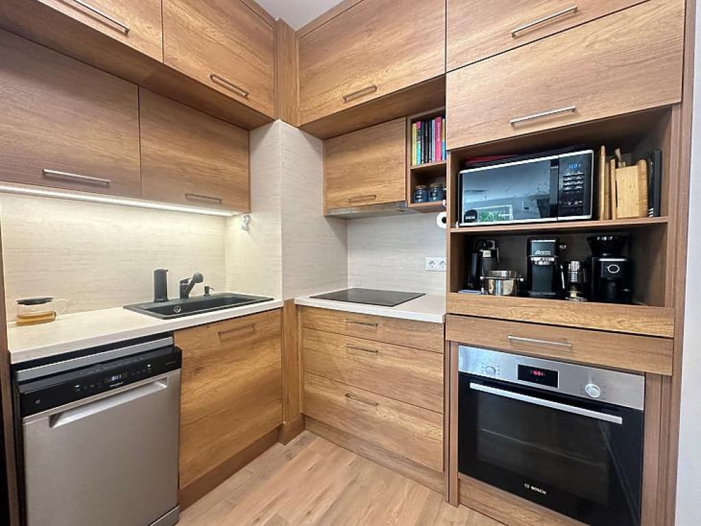 A lakás egyik kiemelt értéke az egységesen, átgondolt koncepció mentén kialakított, beépített bútorzat, amely esztétikailag és funkcionálisan is magas színvonalat képvisel. A konyha teljeskörűen gépesített.